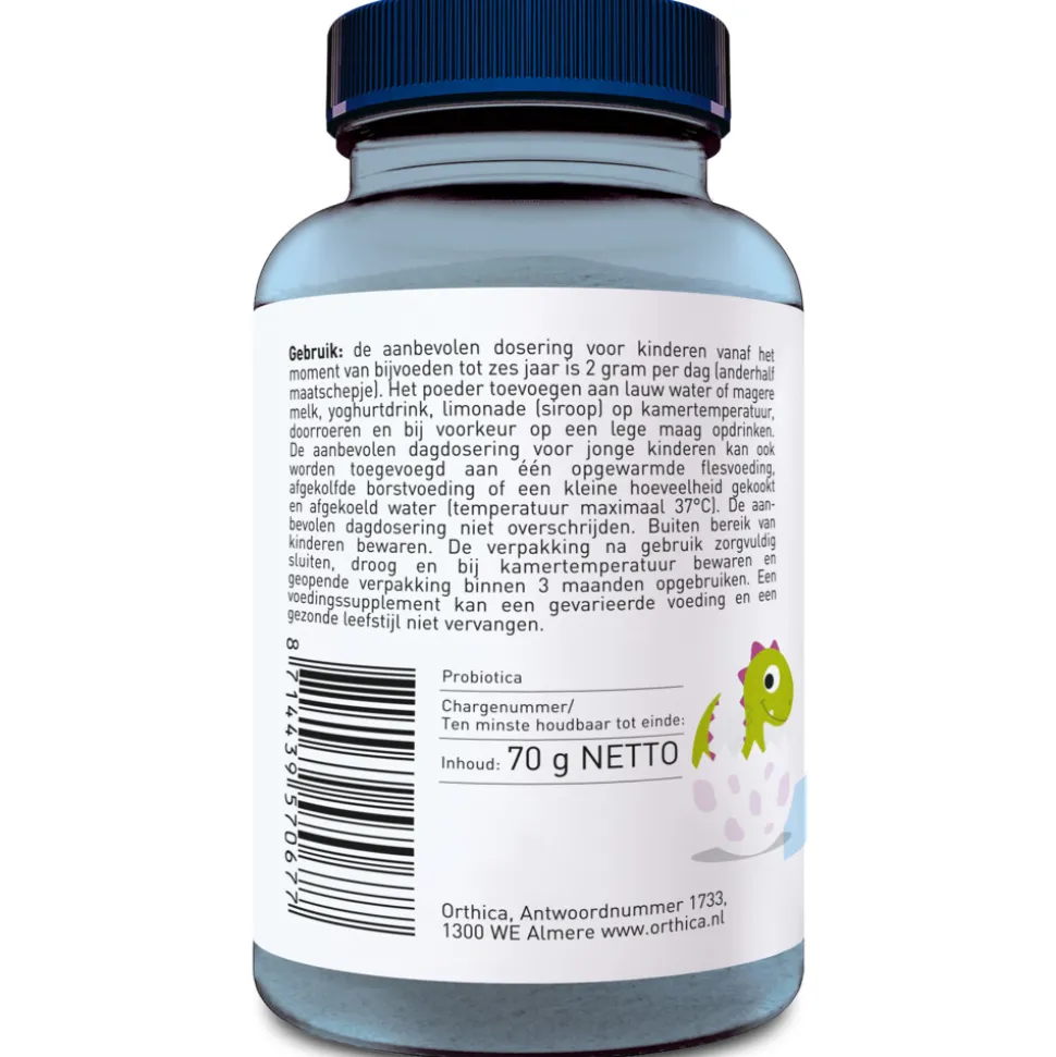 Samenstelling per anderhalf maatschepje (2 gram):Bacteriepreparaat 1,0 x 109 kve* in ongeveer gelijke verhoudingen:Bifidobacterium infantisBifidobacterium lactisLactobacillus acidophilusLactobacillus caseiLactobacillus salivariusLactococcus lactis*kve = kolonievormende eenhedenIngrediënten:Rijstzetmeel, maltodextrine, natuurlijk EIWIT-iosolaat, bacteriecultuur.Vrij van:Gluten, lactose, soja-eiwit, sacharose, synthetische conserveermiddelen en synthetische kleur-, geur- en smaakstoffen. Geschikt voor vegetariërs.Allergeneninformatie:Bevat eiwit.Dosering en Gebruik:De aanbevolen dosering voor kinderen vanaf het moment van bijvoeden tot zes jaar is 2 gram per dag (anderhalf maatschepje). Het poeder toevoegen aan lauw water of magere melk, yoghurt drink, limonade (siroop) op kamertemperatuur, doorroeren en bij voorkeur op een lege maag opdrinken. De aanbevolen dagdosering voor jonge kinderen kan ook worden toegevoegd aan één opgewarmde flesvoeding, afgekolfde borstvoeding of een kleine hoeveelheid gekookt en afgekoeld water (temperatuur maximaal 37°C). De aanbevolen dagdosering niet overschrijden. Extra gebruikstips:Het heeft de voorkeur om probiotica op de nuchtere maag in te nemen. Als de maag leeg is, zijn de probiotica bacteriën korter in de maag aanwezig en worden er nog geen spijsverteringssappen aangemaakt. Die sappen zijn natuurlijk nuttig voor de vertering, maar ze verlagen de overlevingskans van de bacteriën in het product. Wacht na het innemen van het supplement een half uurtje met eten, anders worden deze sappen alsnog geactiveerd. Lukt het een keer niet om de probiotica op nuchtere maag in te nemen, neem ze dan op een ander willekeurig moment.Waarom oplossen?De Orthiflor producten in poedervorm en het poeder uit de capsules dienen bij voorkeur eerst te worden opgelost en doorgeroerd in handwarme vloeistof (zie hierboven), voordat u ze inneemt. De miljarden bacteriën in de capsules, los poeder of zakjes zijn bij de productie in een soort ‘slaaptoestand’ gebracht waardoor ze voor langere tijd bewaard kunnen worden en hebben vloeistof nodig om weer tot leven te komen. Wanneer ze in hun ‘slaaptoestand’ direct in het maagzuur terecht zouden komen, dan zou een groot gedeelte van de bacteriën dit niet overleven. Ook koude vloeistof vinden de bacteriën niet prettig. Handwarme vloeistof heeft de voorkeur. Kiest u voor gemak en neemt u probiotica in kauwtabletten, dan zorg uw speeksel voor het benodigde vocht.Extra informatie: