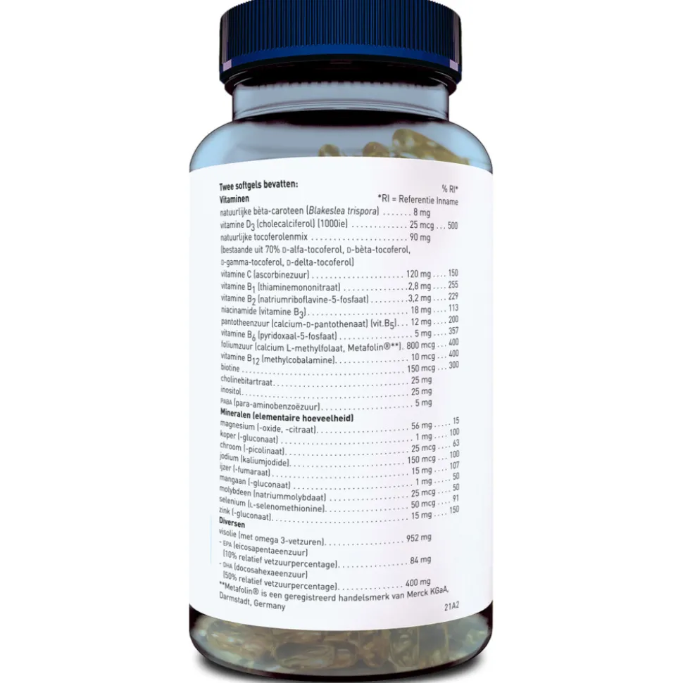 Visolie, rundergelatine, mineralen, vitaminen, zonnebloemolie, geleermiddel (glycerine), tocoferolenmix, stabilisator (bijenwas), zonnebloemlecithine, cholinebitartraat, inositol, PABA.