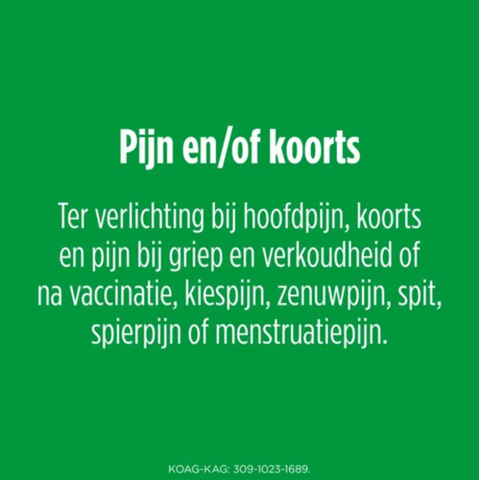 | Te gebruiken bij | Te gebruiken bij de symptomatische behandeling van milde tot matige pijn en/of koorts. |
