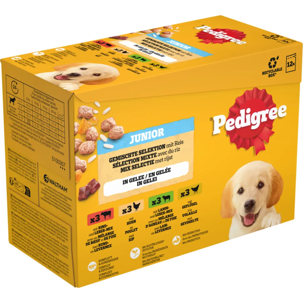 De Pedigree Multipack Maaltijdzakjes Junior bevat natvoeding in gelei, een perfect uitgebalanceerde combinatie van gezonde ingrediënten, speciaal voor jouw puppy. Een verpakking bevat 4 smaakvarianten. Pedigree Maaltijdzakjes richten zich volledig op de 4 basisbehoeften van de junior hond.