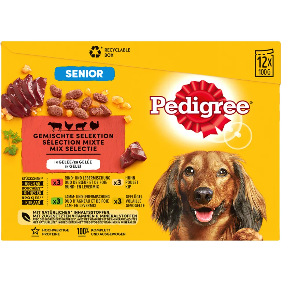De Pedigree Multipack Senior Maaltijdzakjes bevat natvoeding in gelei, speciaal afgestemd op de behoeften van ouder wordende honden. Voorzien van gezonde voedingsstoffen en alles wat jouw hond nodig heeft. Een multipack bevat 12 maaltijdzakjes met 4 smaakvarianten.