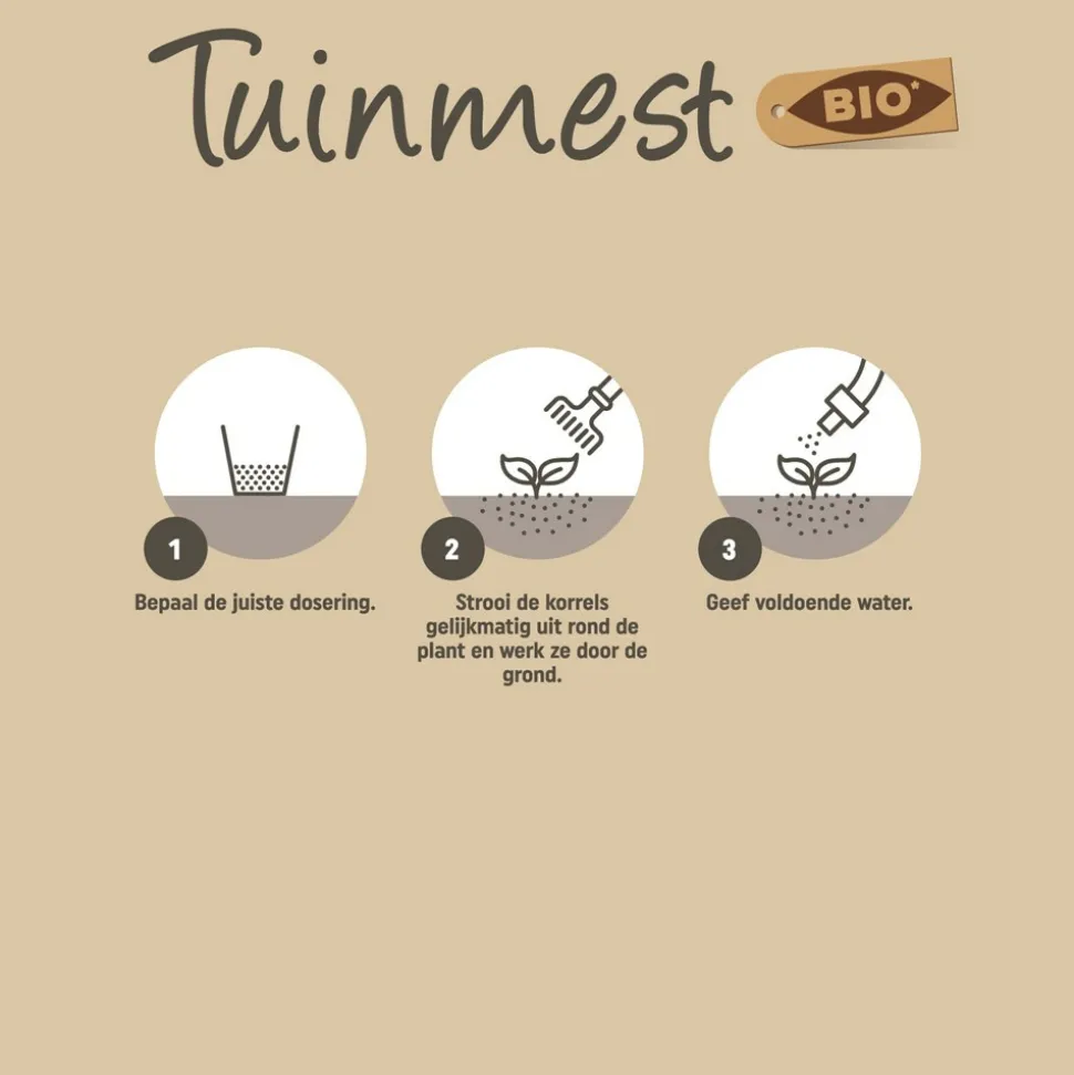 Planten in de volle grond hebben 40-50 gram tuinmest nodig. Jonge planten hebben voldoende aan 20-25 gram tuinmest.