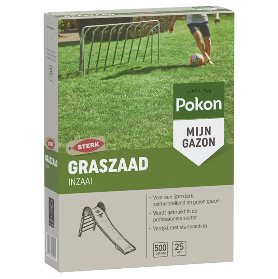 Pokon Graszaad Inzaai is geschikt voor het inzaaien van een nieuw gazon. Het graszaad is gecoat voor optimale kieming en uniek vanwege het zelfherstellende vermogen; het creëert (horizontale) uitlopers door middel van RPR-technologie. In plaats van losse grasplantjes, zoals traditioneel gras, heeft ieder grasplantje van RPR-technologie een link naar andere grasplantjes. Hierdoor ontstaat een ijzersterk gazon, RPR-technologie wordt door zijn betredingstolerantie o.a. gebruikt in de professionele voetbalsector. Voor een optimale ontkieming is het van belang dat de grond niet te koud is en dat de buitentemperatuur hoger is dan 15C (max. 25C). Zaai in een vochtige grond en bij windstil weer. Wanneer er geen regen is gevallen, besproei dan eerst de grond. Zaai het graszaad gelijkmatig en niet te dicht op elkaar, dit belemmert de ontwikkeling. Kiemduur is 2 tot 3 weken, afhankelijk van lucht- en bodemtemperatuur en hoeveelheid vocht. Zorg ervoor dat de grond na het zaaien de eerste 2 tot 4 weken vochtig blijft door voorzichtig en gelijkmatig te sproeien. Droogt de bovenlaag uit, dan mislukt de kieming of sterven de kleine grasplantjes af. Maai het gazon voor het eerst als het gras circa 8 tot 10 cm lang is met een hoog afgestelde, scherpe maaimachine.