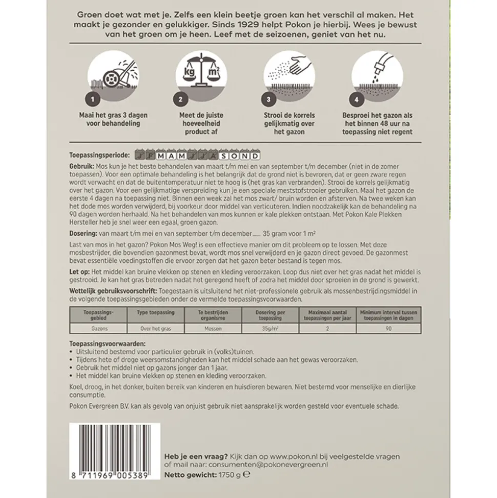 Pokon Mos Weg helpt om mos in het gazon snel en effectief te bestrijden. Dit product bevat niet alleen een mosbestrijder, maar ook gazonmest. Zo wordt het mos verwijderd én krijgt het gras direct de juiste voedingsstoffen om sterker te groeien. Voor het beste resultaat behandel je het gazon in het voor- of najaar, wanneer de bodem niet bevroren is en er geen zware regen wordt verwacht. Binnen een week verkleurt het mos en sterft het af. Na twee weken kun je het dode mos eenvoudig verwijderen door te verticuteren. Indien nodig kun je de behandeling na 90 dagen herhalen.
