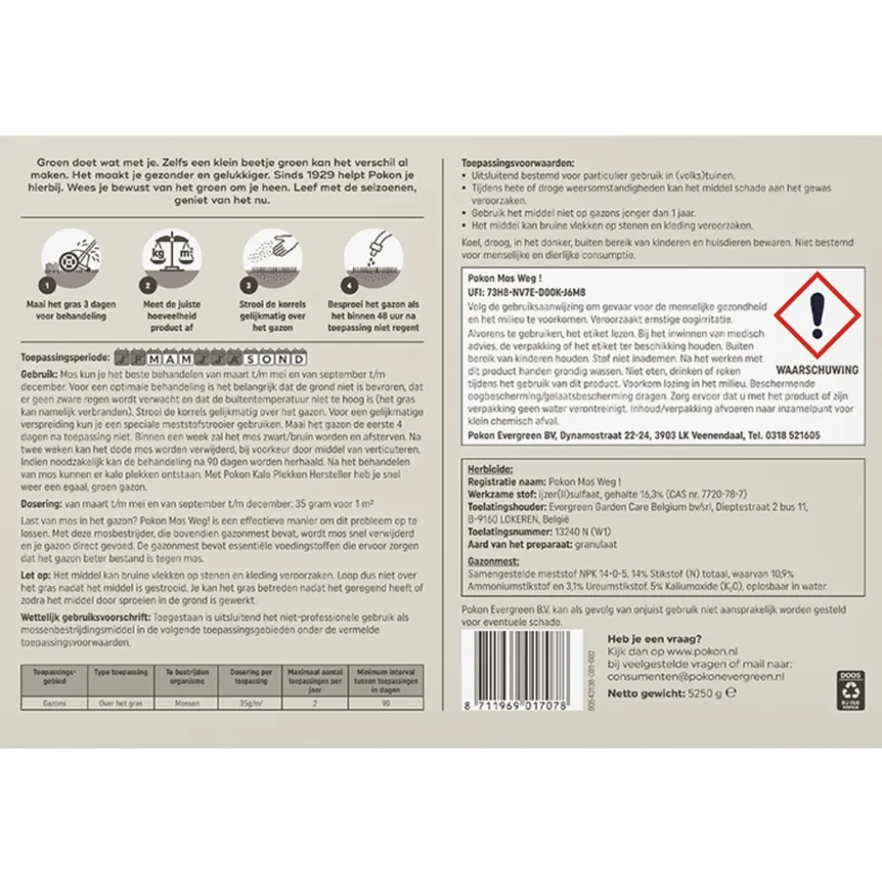 Pokon Mos Weg! biedt een snelle en effectieve oplossing voor mos in je gazon. Deze mosbestrijder bevat gazonmest die je gras voedt en sterker maakt, zodat het beter bestand is tegen mos. Je behandelt het gazon het beste van maart t/m mei en september t/m december. Het product zorgt ervoor dat mos snel afsterft en het gras sneller kan groeien. Maai het gazon de eerste 4 dagen na toepassing niet. Binnen een week wordt het mos zwart of bruin. Na twee weken kun je het dode mos verwijderen door te verticuteren. Herhaal de behandeling indien nodig na 90 dagen.