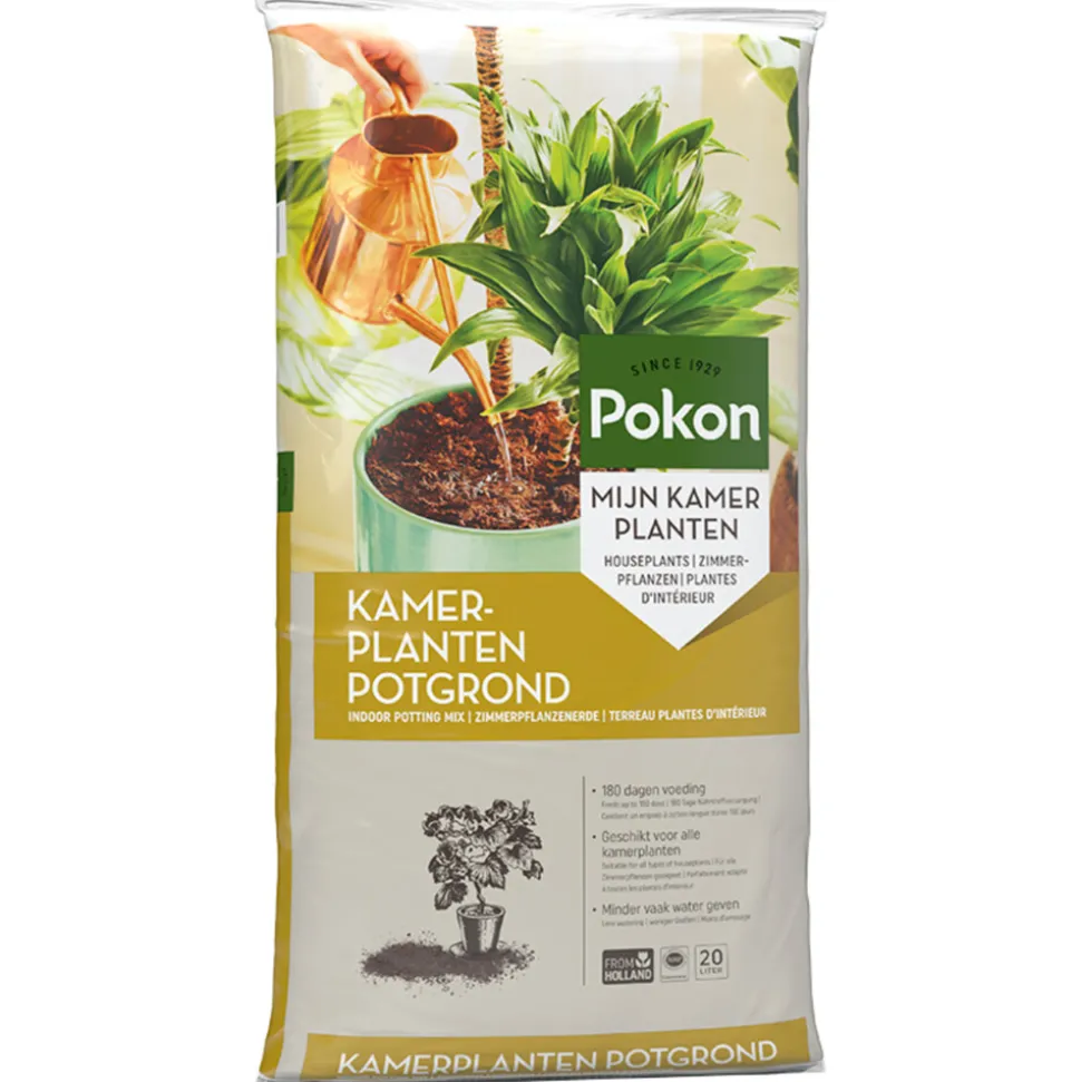 Pokon Potgrond Kamerplanten is geschikt voor alle kamerplanten, dus zowel voor bloeiende als voor groene planten. Kamerplanten staan binnen niet in hun natuurlijke omgeving en hebben daarom een goede voedingsbodem nodig. Deze grond bestaat uit hoogwaardige grondstoffen als tuinturf, grove turfblokjes en turfstrooisel. Er zit daarnaast voldoende voeding in voor ca. 180 dagen.