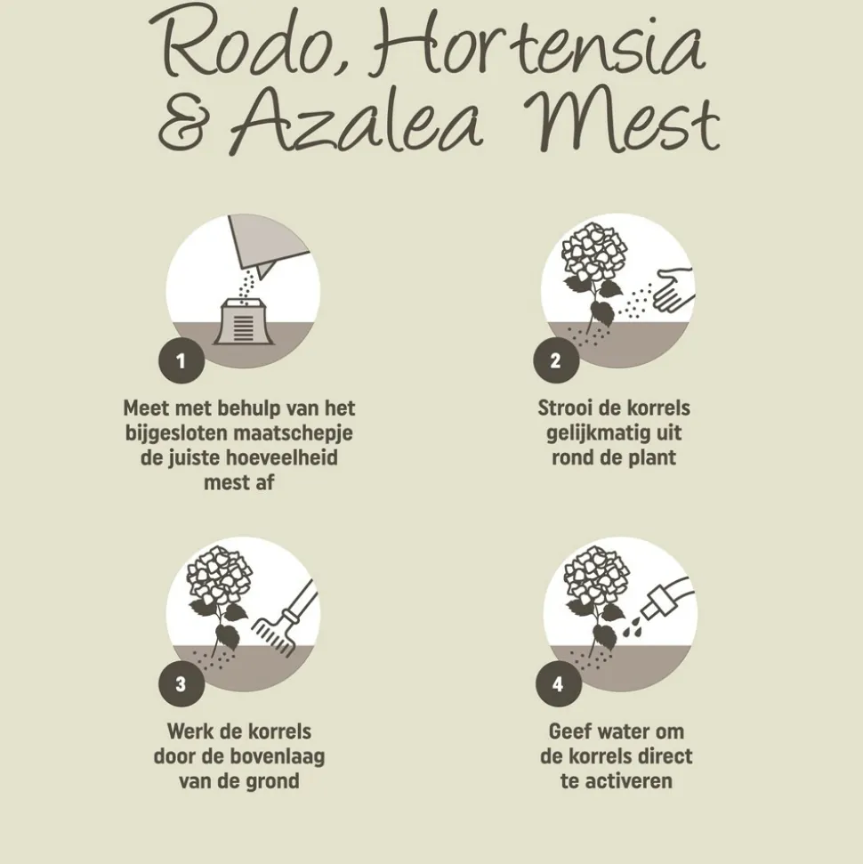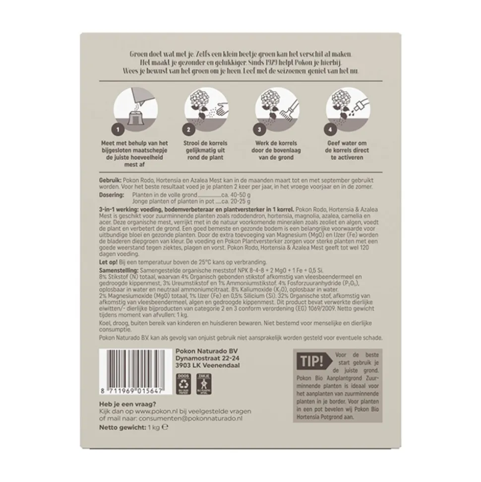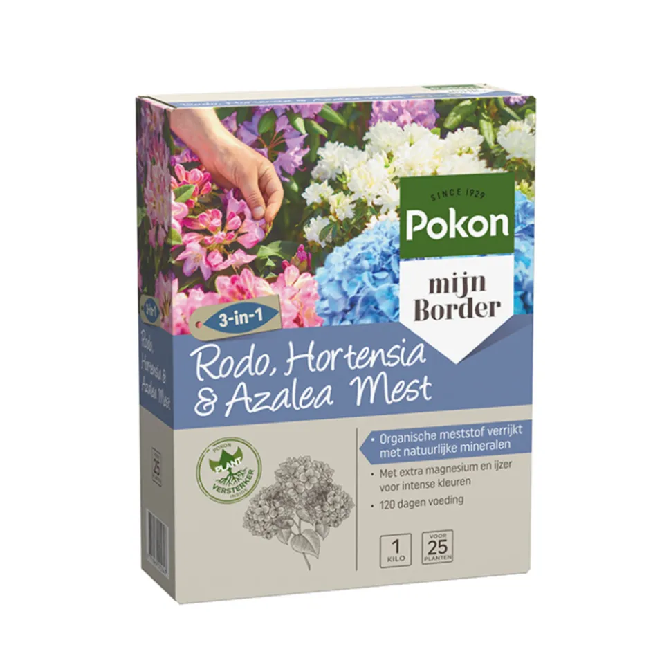 - Pokon Rodo, Hortensia & Azalea Mest biedt een 3-in-1 werking: voeding, bodemverbetering en plantversterking.