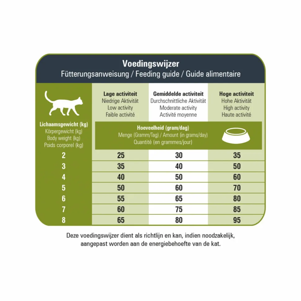 Omega 3-vetzuren (2,8%) dragen bij aan een verbeterde conditie van de gevoelige huid en zorgen voor een glanzende vacht.