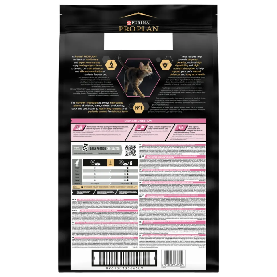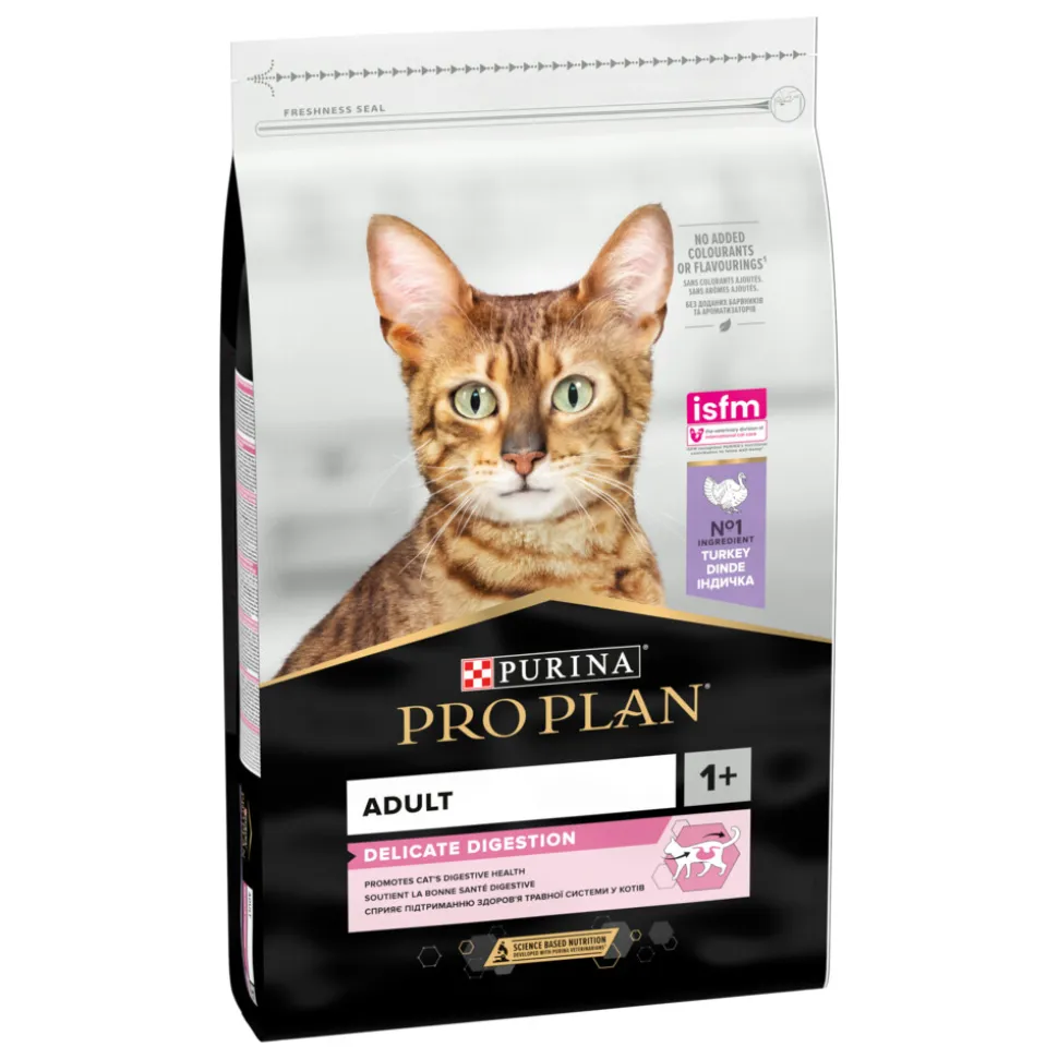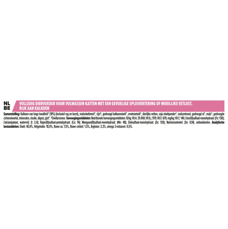 Pro Plan Adult Delicate Digestion Kalkoen (voorheen OptiDigest) is een volledige en droge voeding wetenschappelijk samengesteld voor volwassen katten met een gevoelige spijsvertering. De voeding bevat alle voedingsstoffen die jouw kat nodig heeft voor de dagelijkse vitaliteit en gezondheid op de lange termijn. Delicate Digestion, aantoonbare ondersteuning van een gezonde spijsvertering dankzij natuurlijke prebiotica.