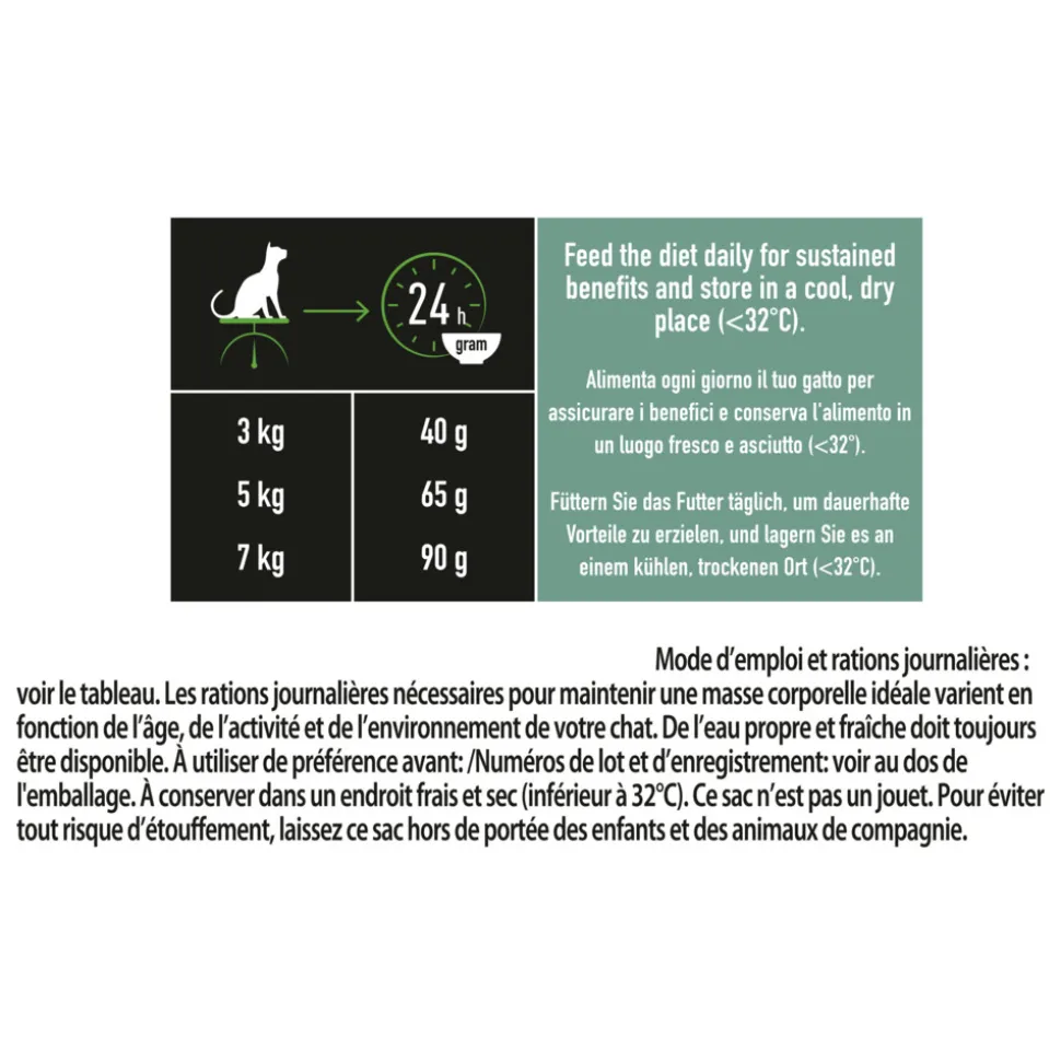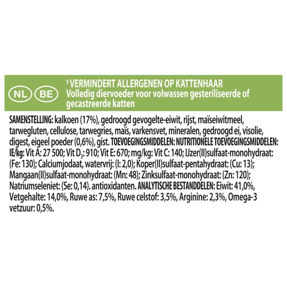 Kalkoen (17%), eiwitten uit gedroogd gevogelte, rijst, maïseiwitmeel, tarwegluten, cellulose, tarwevoermeel, maïs, varkensvet, mineralen, gedroogd ei, visolie, digest, eigeelpoeder, gist.