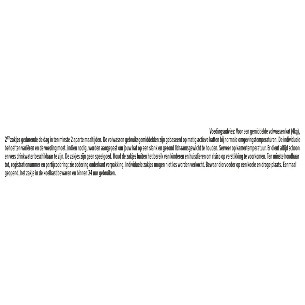 Geef een gemiddelde volwassen kat van 4kg 3 maaltijdzakjes per dag verdeeld over ten minste 2 verschillende maaltijden. De gemiddelde hoeveelheden voor wolwassen katten zijn gebaseerd op matig actieve katten bij normale omgevingstemperaturen. Individuele behoeften kunnen variëren en de voeding moet indien nodig aangepast worden om een gezond gewicht van je kat te behouden. Serveer op kamertemperatuur. Zorg ervoor dat er altijd schoon en vers drinkwater klaarstaat.