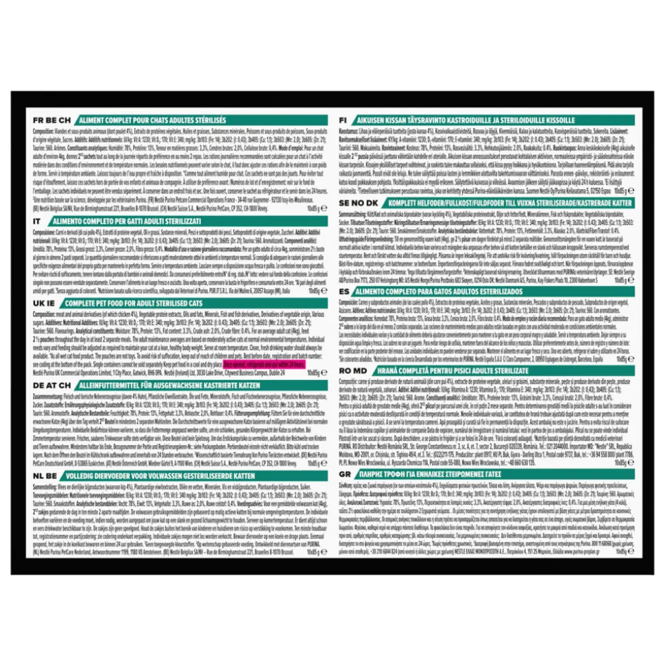 Complete natvoeding wetenschappelijk ontwikkeld voor gesteriliseerde en gecastreerde volwassen katten. Pro Plan Sterilised Nutrisavour bevat alle voedingsstoffen voor de dagelijkse vitaliteit en de gezondheid op lange termijn. Het levert de beoogde voordelen van Purina Pro Plan voeding in een heerlijke natvoeding waar katten van houden.