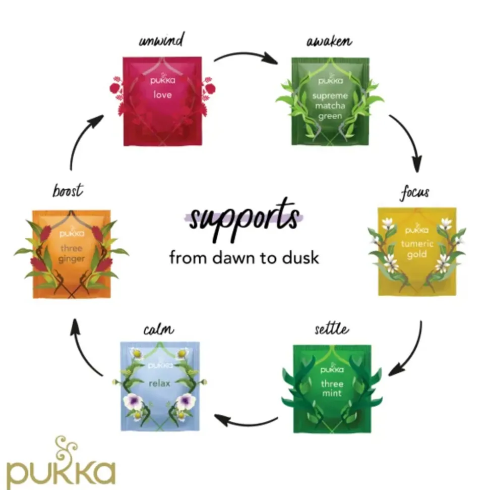 Ontworpen om te ondersteunen van ’s morgens vroeg tot ’s avonds laat, ontdek een dagelijkse reis van vitaliteit en vreugde met heerlijke biologische kruidenthee. Met 90 zakjes van 6 heerlijke smaken, is de Pukka kruidenthee gemengd door de in-house kruidenexperts met behulp van een balans van biologische ingrediënten om plezierige momenten gedurende de dag te creëren. Perfect voor kleine kantoren of als thuiswerk cadeau, ons Workday Wellness cadeau is ideaal voor studenten, leraren of collega’s. De Workday Wellness collectie bevat een verscheidenheid van onze actieve theeën, groene theeën en kalmerende theeën.