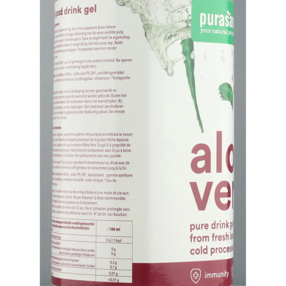 Purasana Aloë Vera Drinkgelis gewonnen uit de Aloë Vera vetplant, bekend om de helende eigenschappen en de hydraterende werking. Dit sap is afkomstig van verse, koud gefilterde pulp zonder de toevoeging van water. Sap van de Aloë Vera plant wordt al eeuwenlang gebruikt vanwege de goede invloed op ons lichaam, huid en haar. Het draagt bij aan de bevordering van de spijsvertering en de afvoer van afvalstoffen. De verwerking van het Aloë Vera sap is tot stand gebracht middels ‘cold process’; er wordt geen gebruik gemaakt van verhitting of pasteurisatie op hoge temperatuur. Hierdoor smaakt het product beter en behoudt het de actieve bestanddelen en er zijn daarnaast geen conserveringsmiddelen of suiker aan toegevoegd.