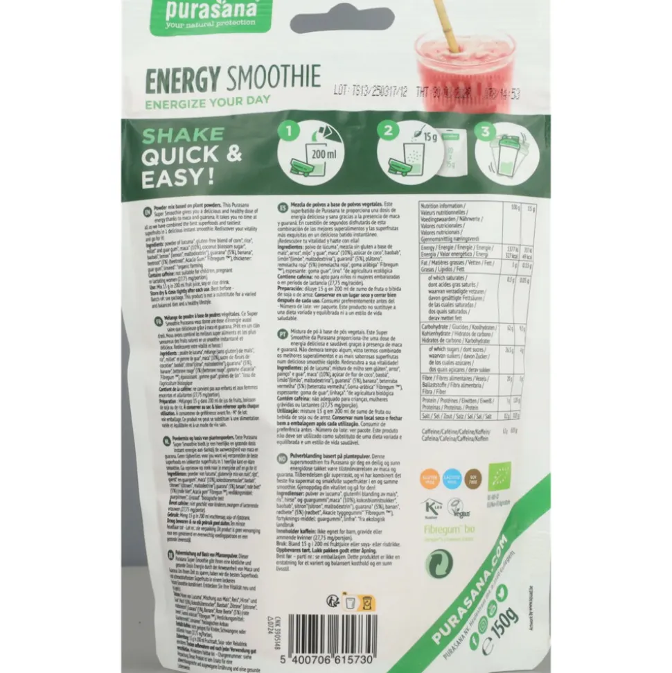 Purasana Energy Shake bevat een combinatie van maca, guarana, baobab, lijnzaad en lucuma. Guarana is een plantaardige bron van cafeine. Het draagt dan ook bij aan de alertheid en gaat vermoeidheid tegen. Maca draagt bij aan een vitaal gevoel. Baobab is een bron van vezels, vitamine C, magnesium en calcium.