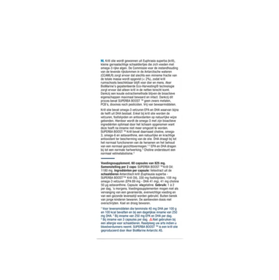 Euphrasia superba (Superba boost™ Krill Oil)(schaaldieren), Omega-3 vetzuren (EPA en DHA, choline, astaxanthine. Capsule: visgelatine.