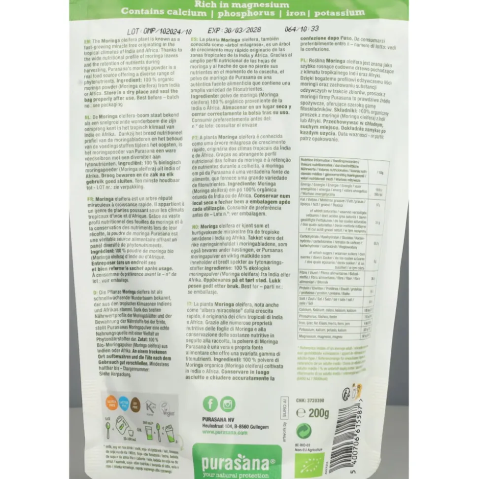 Purasana Moringa poeder wordt gemaakt van de bladeren van de Moringa boom. Deze boom groeit vooral in de tropische gebieden van India en Afrika. Dankzij het breed nutrieel profiel van de moringabladeren blijven de voedingsstoffen tijdens het oogsten behouden. De bladeren zijn rijk aan proteinen en fytonutrienten.