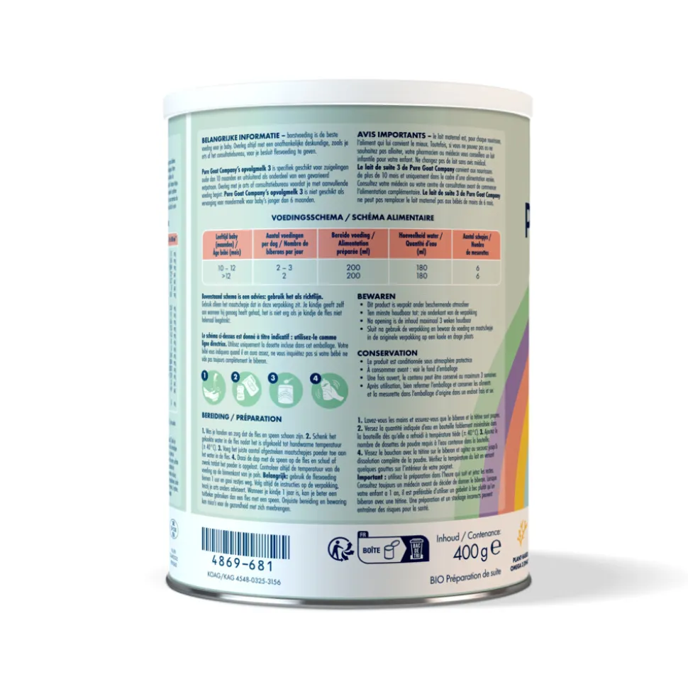 Pure Goat Company’s opvolgmelk 3 is niet geschikt als vervanging voor moedermelk voor baby’s jonger dan 6 maanden.