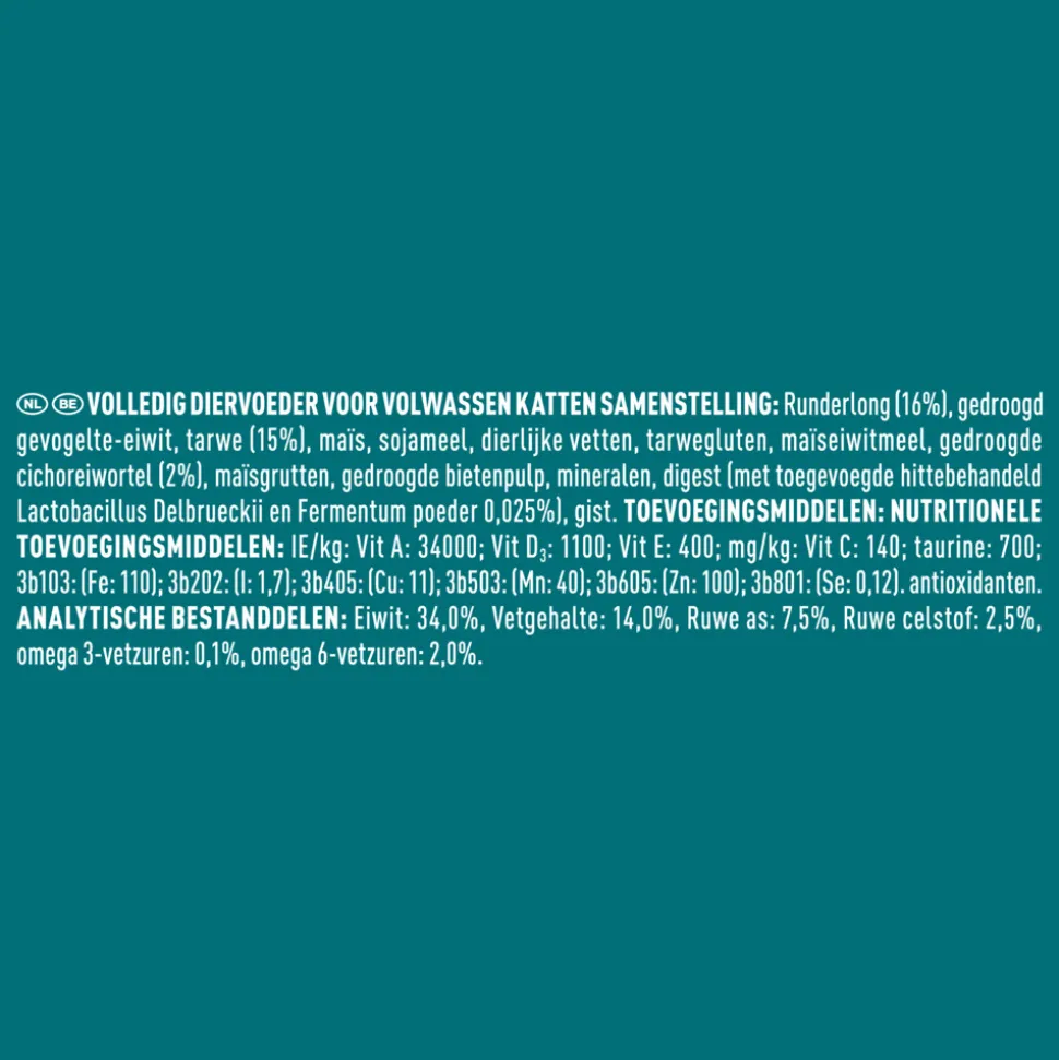 Rund (16%), gedroogde gevogelte-eiwitten, volkoren tarwe (16%), maïs, sojameel, dierlijk vet, tarweglutenmeel, maïsglutenmeel, gedroogde cichoreiwortel, maïsgries, gedroogde bietenpulp, mineralen, digest (met toegevoegde hittebehandelde Lactobacillus Delbrueckii en Fermentum poeder (0,025%)), gist.” Analytische bestanddelen: Eiwit: 34,0%; Vetgehalte: 14,0%; Ruwe as: 7,5%; Ruwe celstof: 2,5%; Omega 6 vetzuren: 2,0%.” Toevoegingsmiddelen: Nutritionele toevoegingsmiddelen: IE/kg: Vit. A: 33 000; Vit. D3: 1 000; Vit. E: 460; mg/kg: Vit. C: 140; Taurine: 700; IJzer(II)sulfaat-monohydraat: 204; Calciumjodaat, watervrij: 2,6; Koper(II)sulfaat-pentahydraat: 41; Mangaan(II)sulfaat-monohydraat: 97; Zinksulfaat-monohydraat: 340; Natriumseleniet: 0,24; Met antioxidanten.” “Aanbevolen dagelijkse hoeveelheid (g/dag):