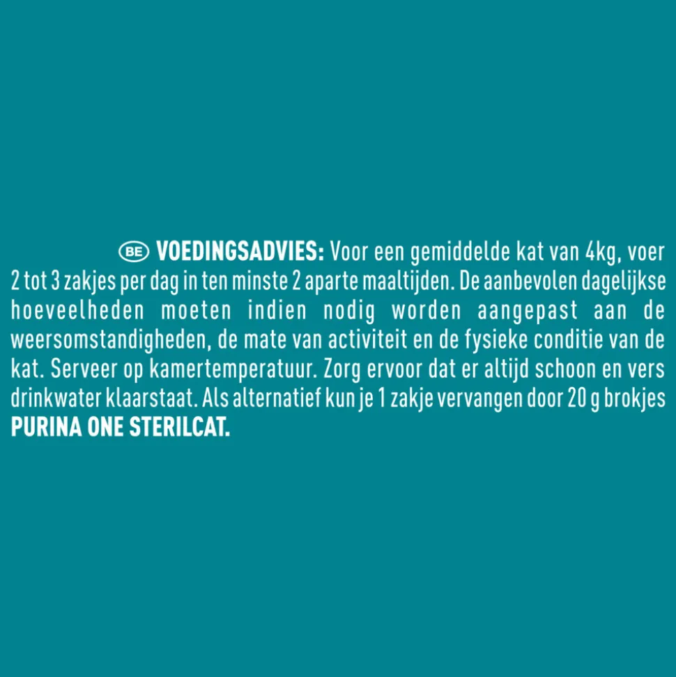 Purina ONE Adult Sterilcat in 85g zakjes biedt jouw gesteriliseerde kat een complete, uitgebalanceerde maaltijd. Dit natvoer bevat malse stukjes rund, kalkoen, kip en zalm, gesneden in fijne reepjes en gecombineerd met groenten zoals wortels en sperziebonen. De heerlijke saus maakt elke maaltijd onweerstaanbaar. Purina’s dierenartsen en voedingsdeskundigen hebben dit recept ontwikkeld om een gezond microbioom te ondersteunen, wat bijdraagt aan een gezonde spijsvertering en het algemene welzijn van jouw kat. Het voer biedt jouw kat hoogwaardige voeding met een rijke smaak en helpt bij het behoud van een gezonde spijsvertering.