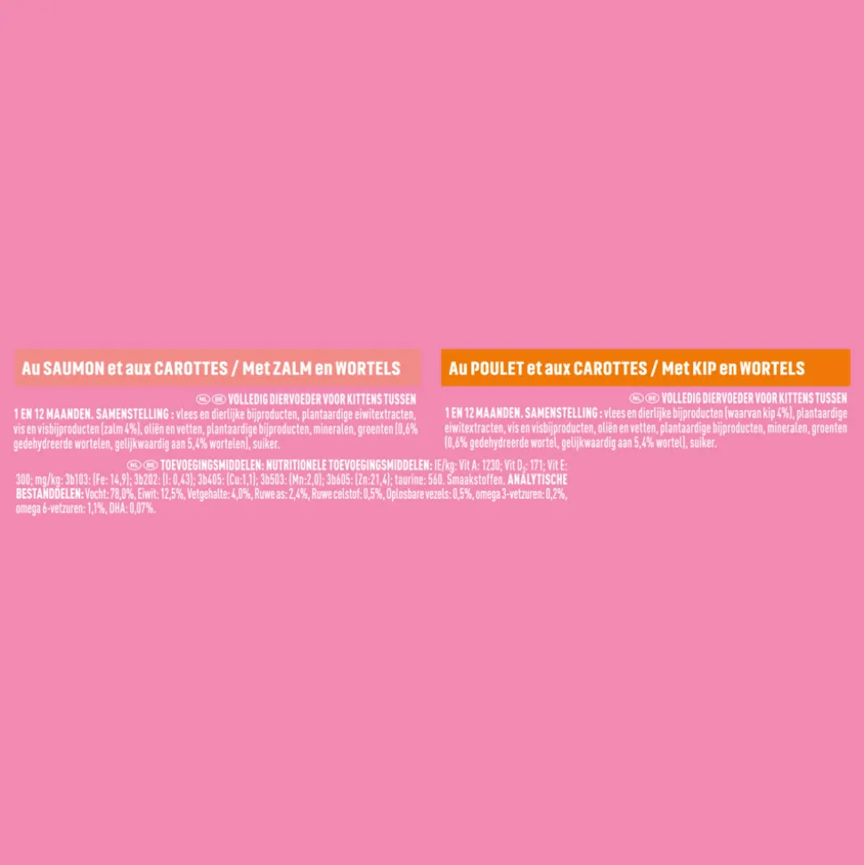 vlees en dierlijke bijproducten, plantaardige eiwitextracten, vis en visbijproducten (zalm 4%), oliën en vetten, plantaardige bijproducten, mineralen, groenten (0,6% gedehydreerde wortelen, gelijkwaardig aan 5,4% wortelen), suiker.