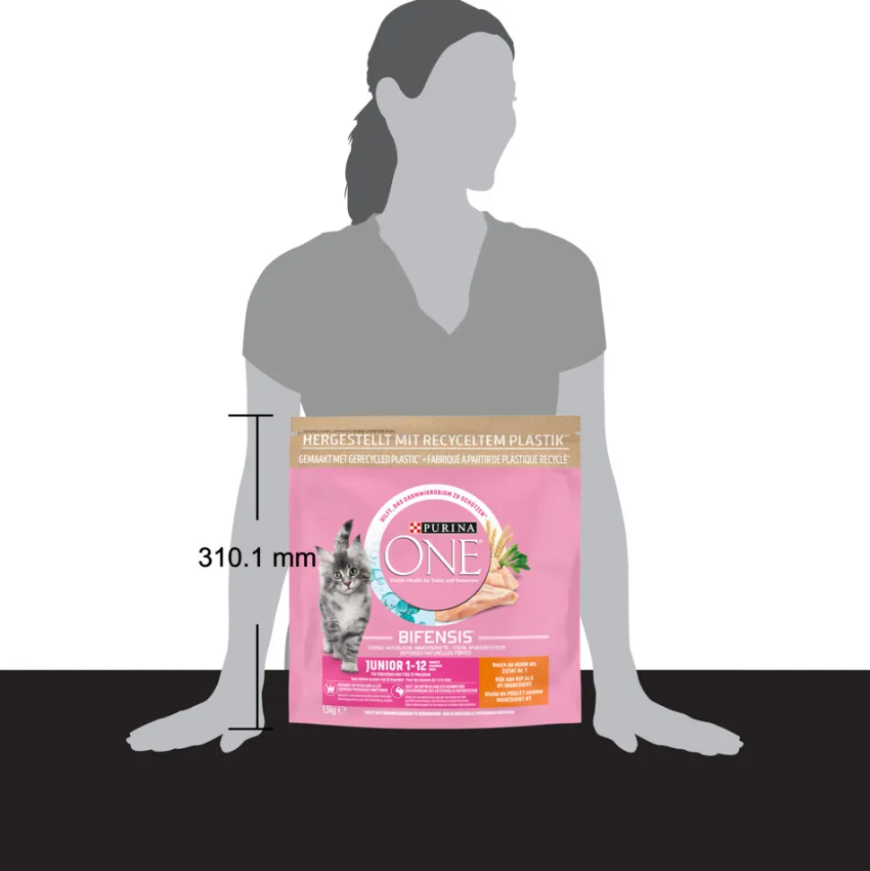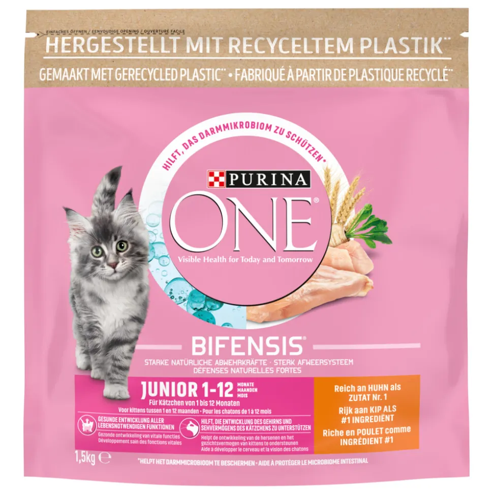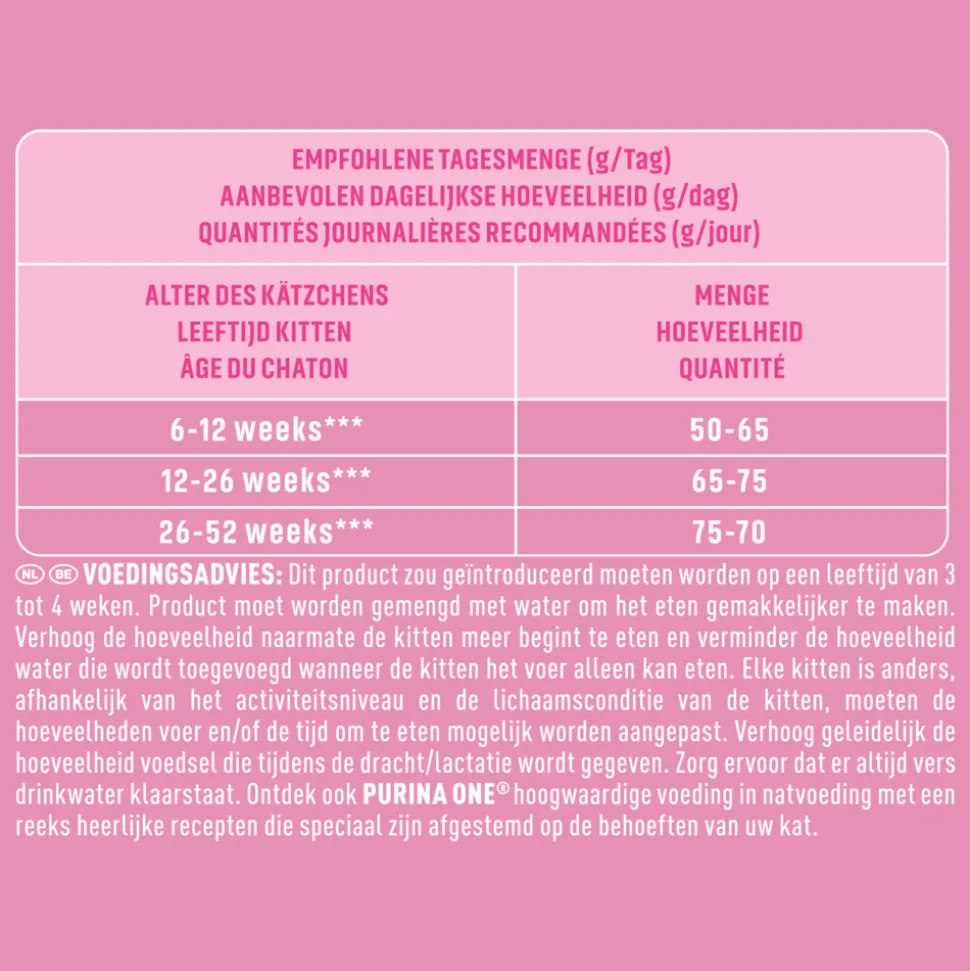 Purina ONE Junior kattenvoer Rijk aan Kip is speciaal ontwikkeld om te voldoen aan de voedingsbehoeften van kittens (van spenen tot 12 maanden) en drachtige of zogende katten.