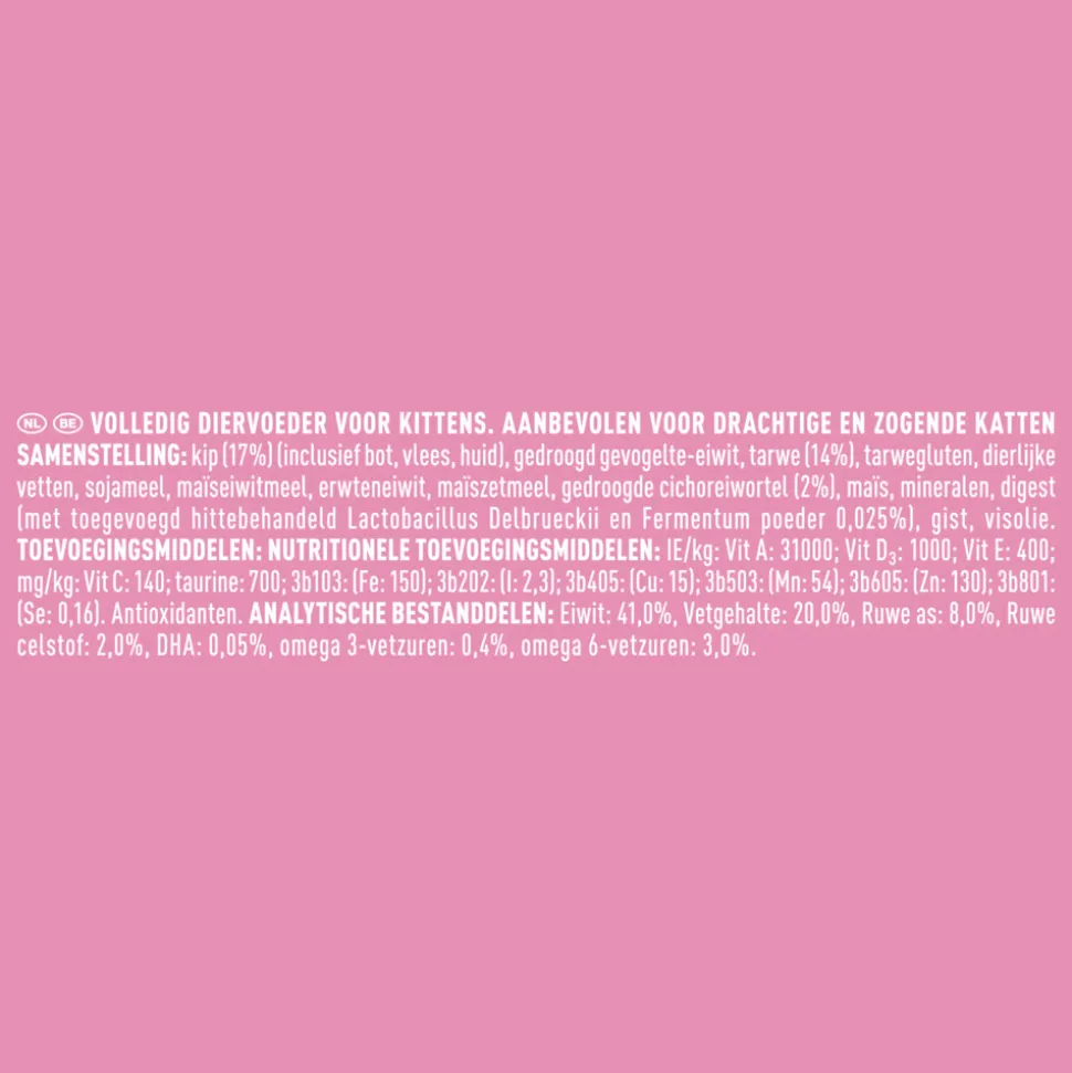 Kip (17%) (inclusief bot, vlees, huid), Gedroogd gevogelte-eiwit, Volkoren tarwe (14%), Varkensvet, Tarwegluten, Maïseiwitmeel, Sojameel, Erwteneiwit, Maïszetmeel, Gedroogde cichoreiwortel, Maïs, Mineralen, Digest (met toegevoegd hittebehandeld Lactobacillus delbrueckii en fermentum poeder 0,025%), Gist, Visolie
