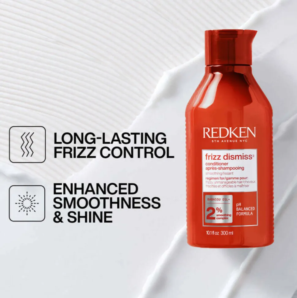 De sulfaat- en natriumchloridevrije Redken Frizz Dismiss Conditioner, voorgeschreven voor bescherming tegen kroezen, temt kroeshaar, verhoogt de gladheid en verbetert de glans. Geformuleerd met Redken’s Smoothing Complex met Babassu-olie dat het haar hydrateert, ontwart en beschermt tegen kroezen, terwijl het zorgt voor verbeterde gladheid en kroescontrole.