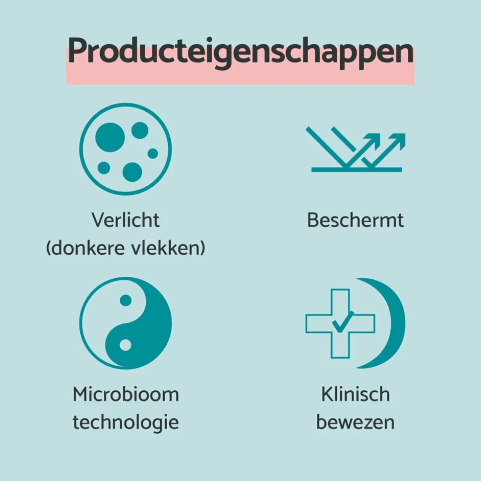 Deze unieke technologie heeft een positieve invloed op het ecosysteem aan bacteriën in en op de huid. Een goed gereguleerd microbioom zorgt voor een sterke huidbarrière en een gezonde, stralende huid.