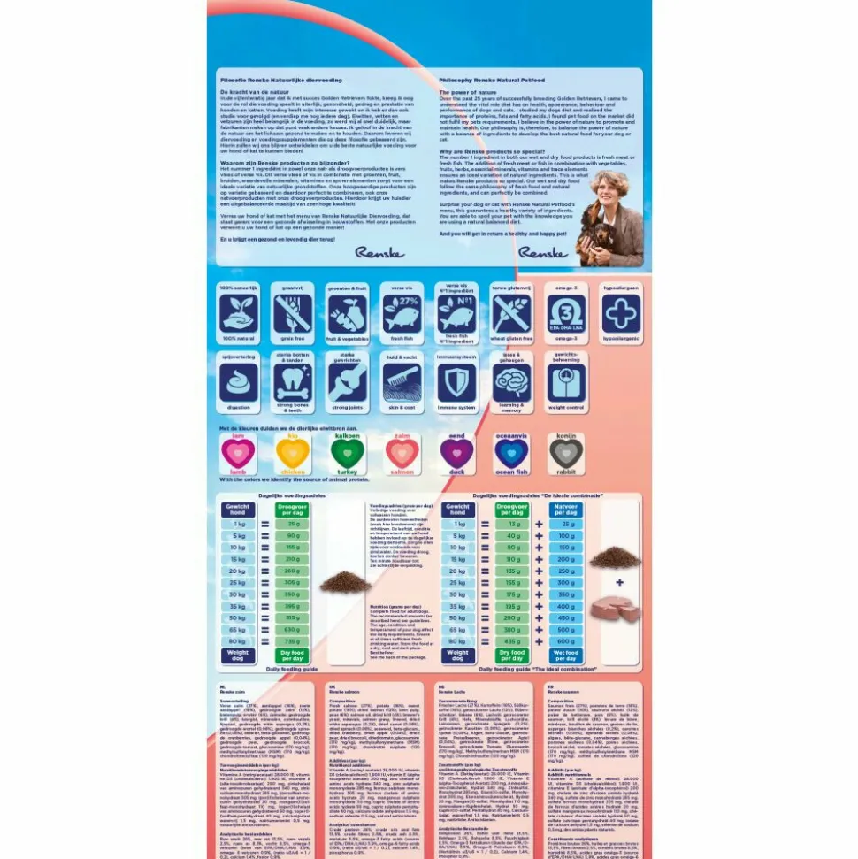 Renske Super Premium Adult Zalm Graanvrij is een complete, licht verteerbare voeding met verse zalm. Het voer is bereid met zalm als hoofdingrediënt (27%, totaal dierlijke ingrediënten 50%). Het voer is graanvrij en zeer geschikt voor honden met huid- en/of vachtklachten en gedragsproblemen. Renske Super Premium Adult Zalm Graanvrij zorgt daarnaast voor een gezonde huid & een glanzende vacht door het percentage aan Omega-3 in deze brok.
