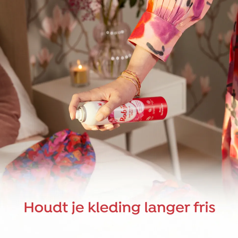 - Robijn Pink Sensation Dry Wash Spray verfrist je kleding tussen wasbeurten