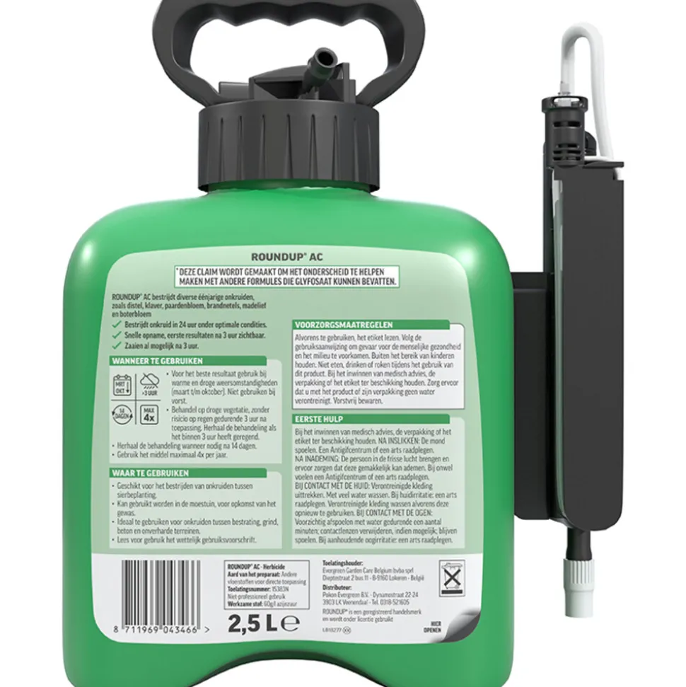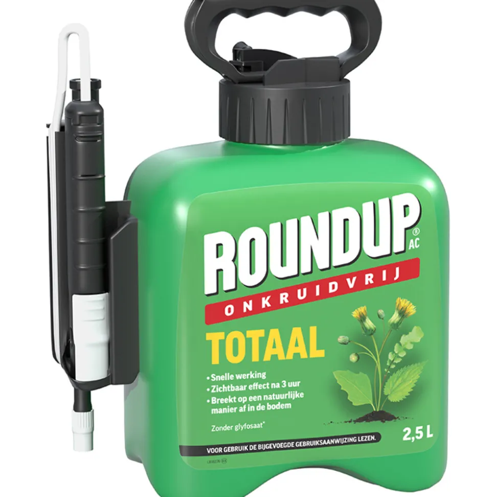 Roundup® AC Snel Onkruidvrij Onkruiddrukspuit 2,5L is een snelwerkende onkruidbestrijder: actief groeiend onkruid wordt binnen een dag gedood. Het hoeft niet aangemengd te worden en is altijd juist gedoseerd. De werkzame stof in deze Roundup® onkruidbestrijder is azijnzuur, dat voorkomt in de natuur en in kleine hoeveelheden ook in planten. Wanneer deze stof in geconcentreerde vorm op ongewenste planten wordt gespoten, verandert ze in een snelwerkende onkruidverdelger. De stof doodt heel snel verschillende lagen van de plantencellen, waardoor de groei stopt en de plant sterft. Roundup® AC is snel inactief in de bodem waardoor zaaien en planten al mogelijk is 1 dag na toepassing. Geschikt voor het bestrijden van onkruiden tussen sierbeplanting. Kan gebruikt worden in de moestuin, voor opkomst van het gewas. Ideaal te gebruiken voor onkruiden tussen bestrating, grind, beton en onverharde terreinen.