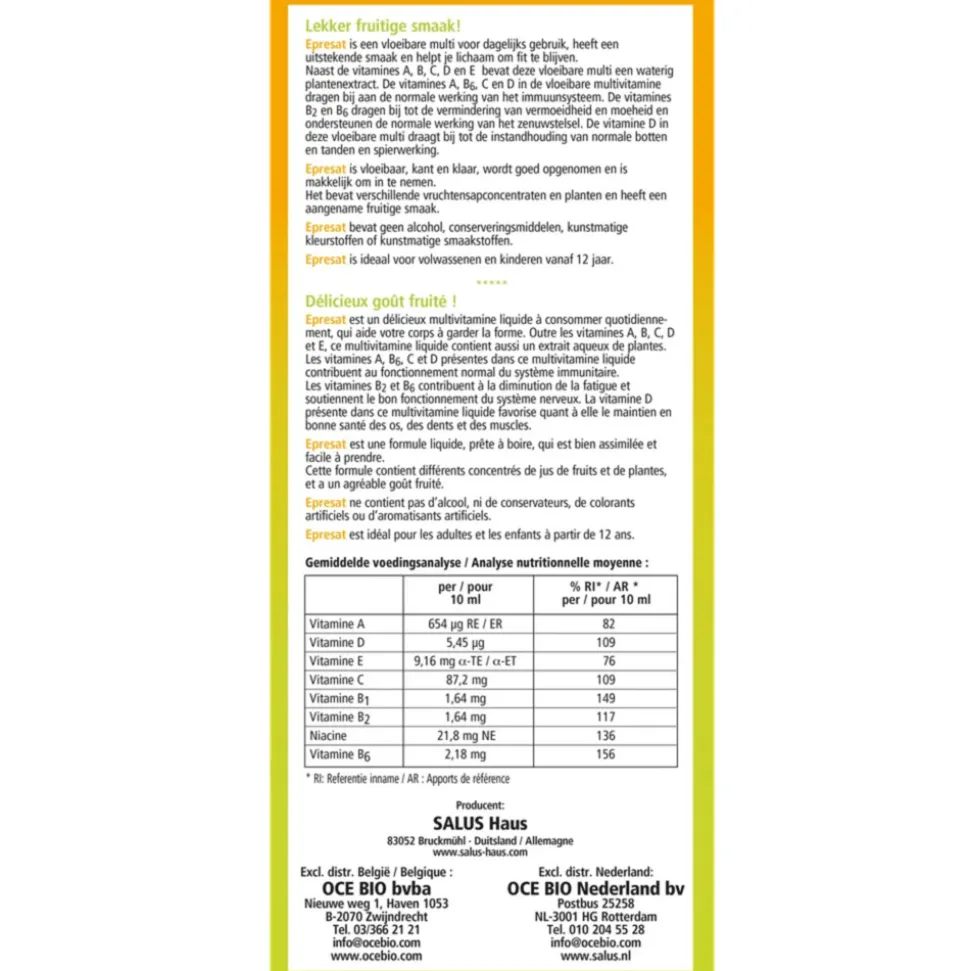 Ingrediënten Epresat bevat de volgende ingredienten: vruchtensap van sinaasappel, guave, passievrucht, abrikoos waterig aftreksel uit: mariadistel, cola, bruine algen, tarwekiem, echinacea fructose waterige gistextracten dikmiddel: alginaat sinaasappelolie Het elixer bevat onder andere vitamine C en echinacea voor meer weerstand, tarwekiemen als bron van vitamine B en kelp voor de belangrijkste mineralen en sporenelementen. Epresat Multivitamine is verkrijgbaar in flessen van 250 ml. Gebruiksaanwijzing Neem dagelijks een half maatbekertje (10 ml) voor de maaltijd. Na opening in de koelkast bewaren. Het elixer is dan nog 4 weken houdbaar.
