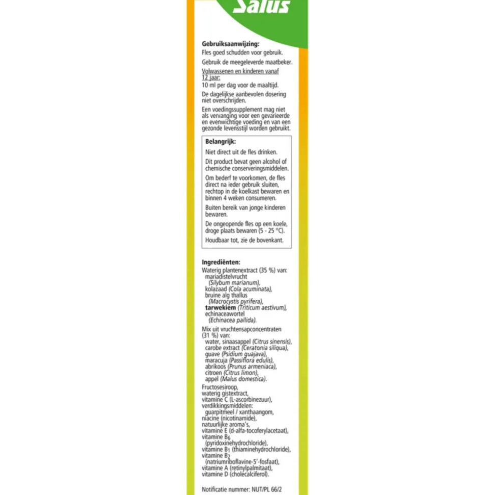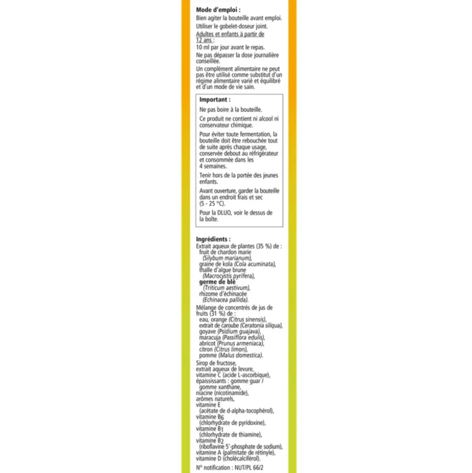 Waterig plantenextract (35%) van: mariadistelvrucht (Silybum marianum), kolazaad (Cola acuminata), bruine alg thallus (Macrocystis pyrifera), TARWEKIEM (Triticum aestivum), echinaceawortel (Echinacea pallida), mix uit vruchtensapconcentraten (31%) van: water, sinaasappel (Citrus sinensis), carobe extract (Ceratonia siliqua), guave (Psidium guajava), maracuja (Passiflora edulis), abrikoos (Prunus armeniaca), citroen (Citrus limon), appel (Malus domestica), fructosestroop, waterig gist extract, vitamine C (L-ascorbinezuur), verdikkingsmiddelen: guarpitmeel / xanthaan gom, niacine (nicotinamide), natuurlijke aromas, vitamine E (d-alfa-tocoferylacetaat), vitamine B6 (pyridoxinehydrochloride), vitamine B1 (thiaminehydrochloride), vitamine B2 (natriumriboflavine-5’-fosfaat), vitamine A (retinylpalmitaat), vitamine D (cholecalciferol).