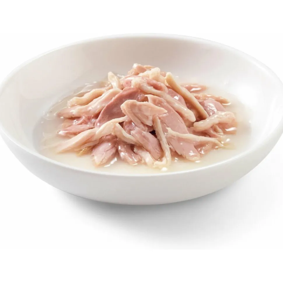 Tonijn 37,8%, kipfilet 37,7%, visbouillon 23,1%, rijst 1,4%.