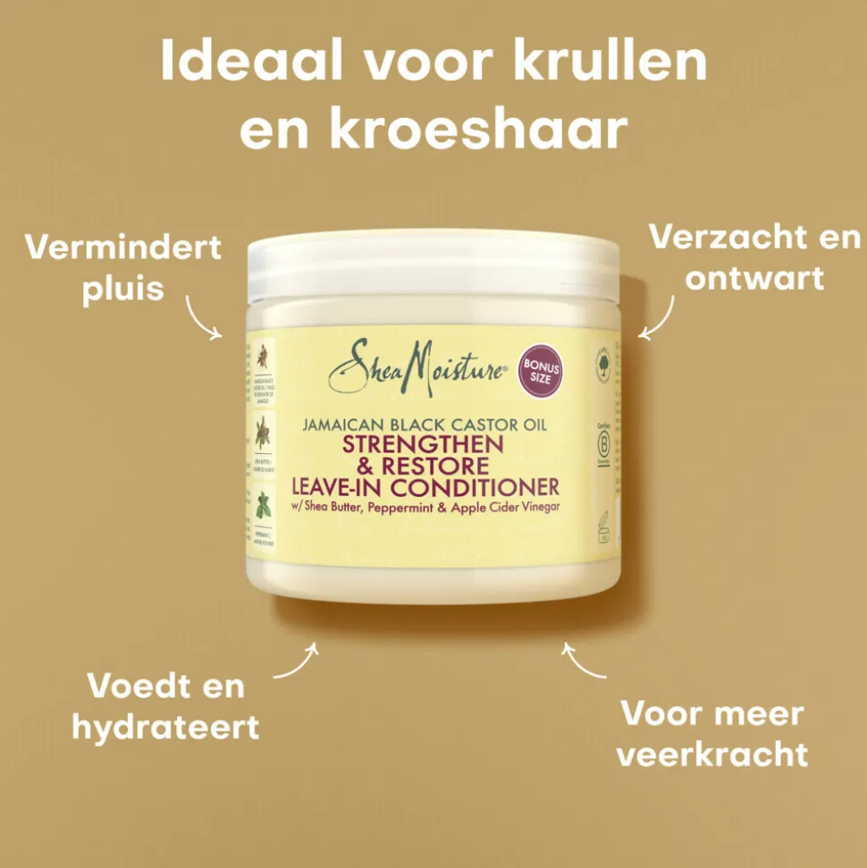 SheaMoisture Jamaican Black Castor Oil Strenghten & Restore Leave-In Conditioner voor krullend haar biedt hydratatie, glans en bescherming tegen haarbreuk.