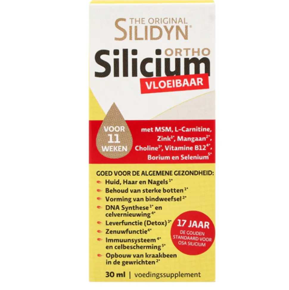 Silidyn levert de best opneembare en werkzame silicium vorm, als Ortho Siliciumzuur (OSA), in geconcentreerde druppelvorm die eenvoudig vermengd kan worden met water of een drankje. Naast het Ortho Silicium monomeer complex is Silidyn verrijkt met MSM, Zink, Borium, Vitamine B12, Choline, Mangaan en Selenium.