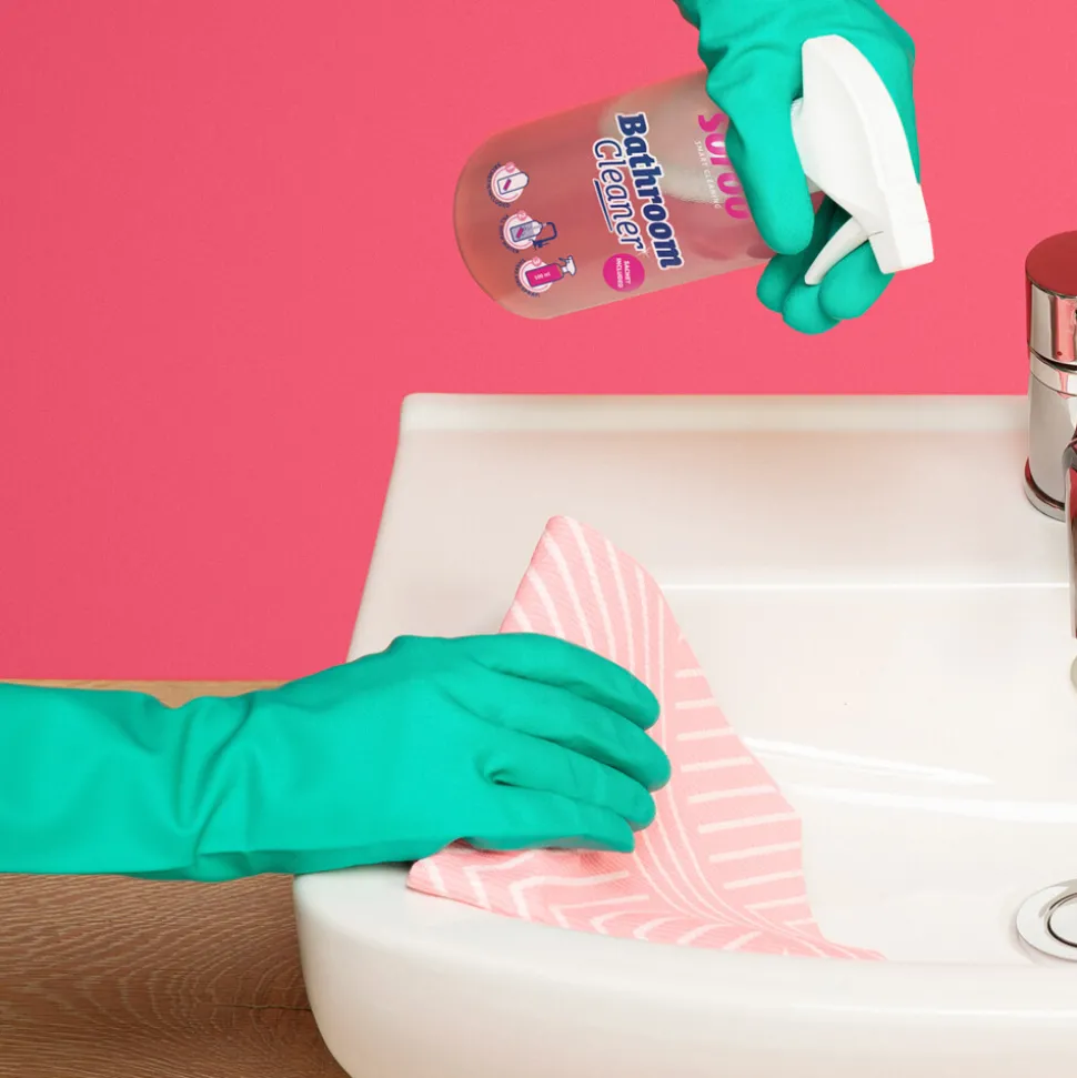 - Gebruik de groene doek voor de andere oppervlakken in de badkamer
