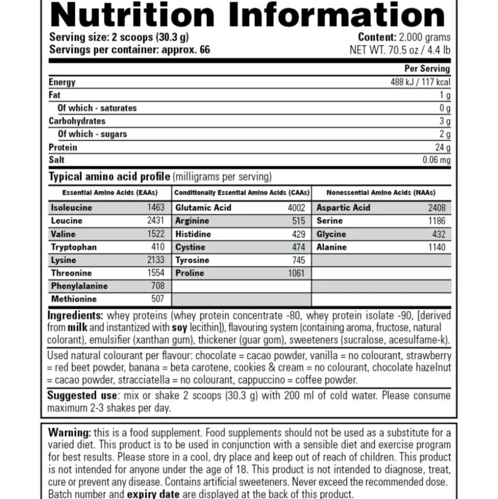 Mix of shake 1 maatschep 100% Whey (circa 30 gram) met 300 ml melk (aanbevolen), fruitsap, of water. Bij zwaardere trainingsactiviteit maximaal 4 schepjes (120 gram) per dag. 100% Whey is een ‘instantized’ product en mixt dus gemakkelijk in iedere vloeistof. Een shake smaakt het lekkerst met 300 ml melk, maar 100% Whey is ook heerlijk met 200 ml koud water.