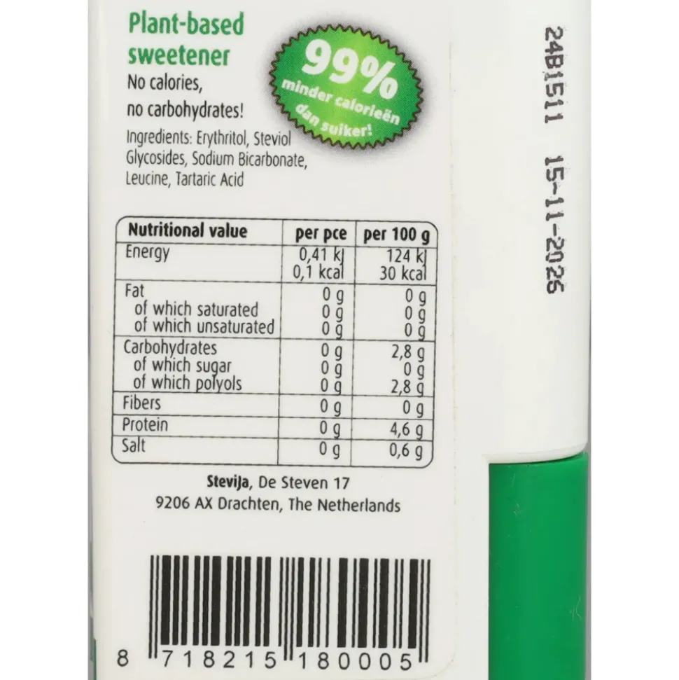 Steviolglycosiden, Erythritol, Natriumbicarbonaat, Wijnsteenzuur, Magnesiumstearaat.