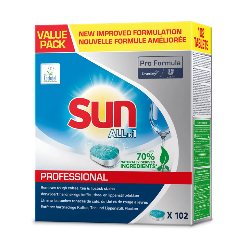 Sun All-in-1 Professionele Vaatwastabletten van Pro Formula is een krachtpatser voor een vlekkeloze vaat. De All-in-1 oplossing bevat ingebouwde spoelglansmiddel- en zoutfuncties, die zorgen voor een uitzonderlijke glans en kalkaanslag voorkomen. Verwijdert vet en hardnekkige vlekken zoals koffie, thee en lippenstift, voor een sprankelend schoon resultaat bij elke afwasbeurt. Met het EU Ecolabel voldoet ons product aan strenge milieunormen gedurende de hele levenscyclus, van materiaalwinning tot afvalverwijdering. Verhoog uw professionele afwaservaring met efficiëntie en milieubewustzijn.