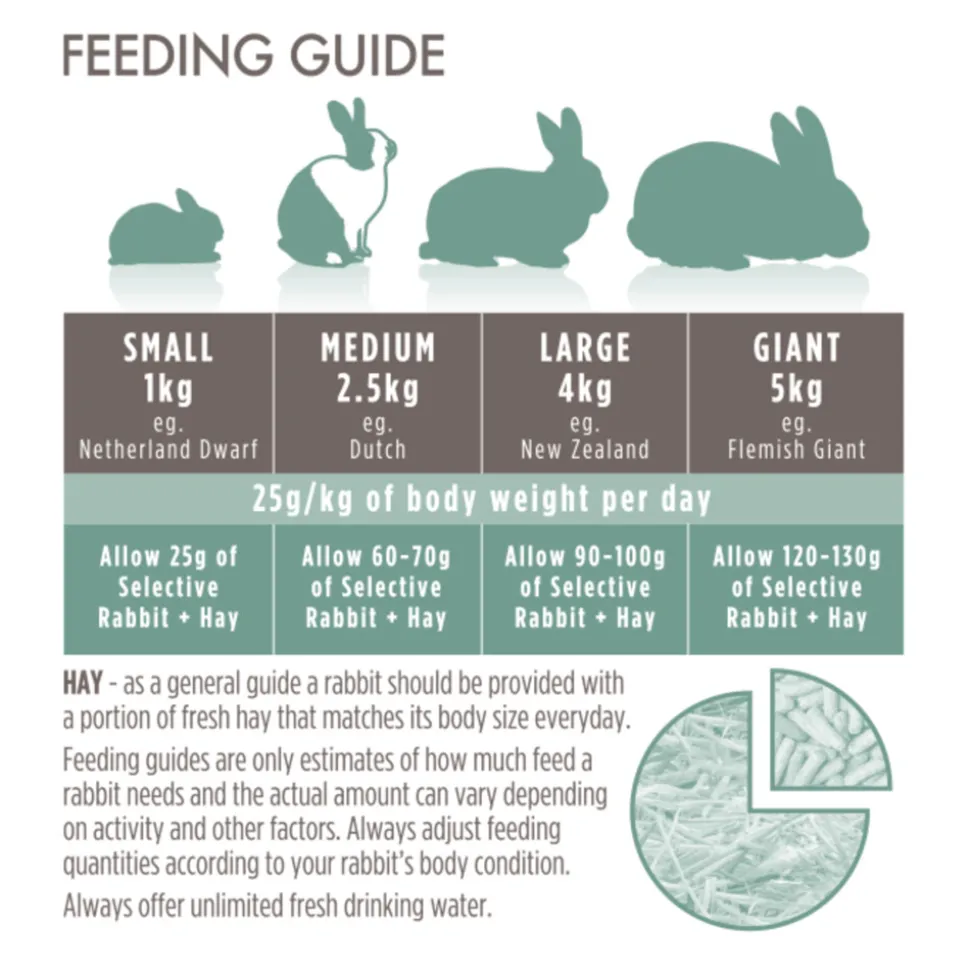 Een gemiddeld volwassen konijn (2,5 kg) heeft 60-70 g/dag Selective Rabbit Grain Free nodig. Het dier moet altijd verse groenten, hooi van goede kwaliteit en schoon drinkwater hebben. Koel en droog bewaren.