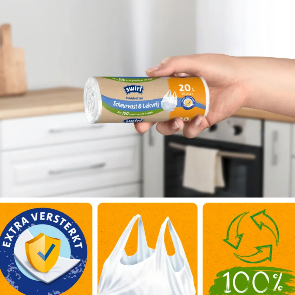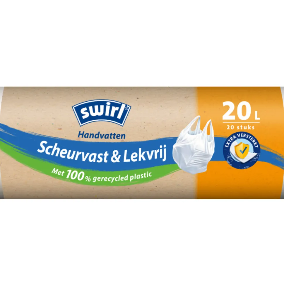 Swirl® Scheurvast & Lekvrij 20L met handvatten is door de extra versterkte folie zeer scheurvast, waardoor je er allerlei afval mee kunt verwijderen. De zakken kunnen dankzij de handige handvatten gemakkelijk worden gesloten en weggedragen. Swirl® pedaalemmerzakken zijn gemaakt van minstens 80% gerecycled plastic en daarvan is minstens de helft (40%) afkomstig uit post-consumer plastic afval.
