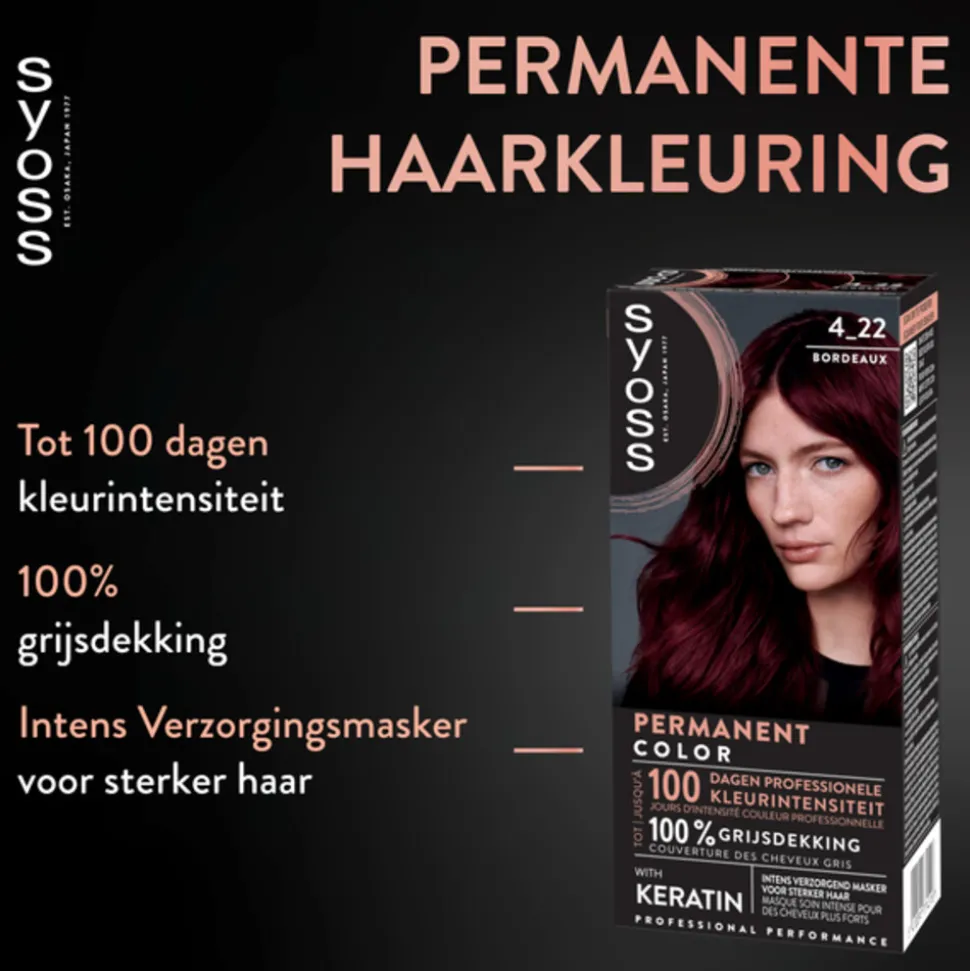 SYOSS permanente haarkleuringen, ontworpen voor professionele resultaten, zorgen ervoor dat je haarkleur er langdurig levend uitziet en aanvoelt. De kleurcrème, met rijke kleurpigmenten en keratine, dringt diep in de haarvezel om tot 100 dagen professionele kleurintensiteit en tot 100 % grijsdekking te garanderen. Het intens verzorgend masker met keratine versterkt het haar intens van binnenuit en maakt het haaroppervlak glad: de kleurpigmenten worden goed vastgelegd en onthullen de levendigste en rijkste kleuren van SYOSS.