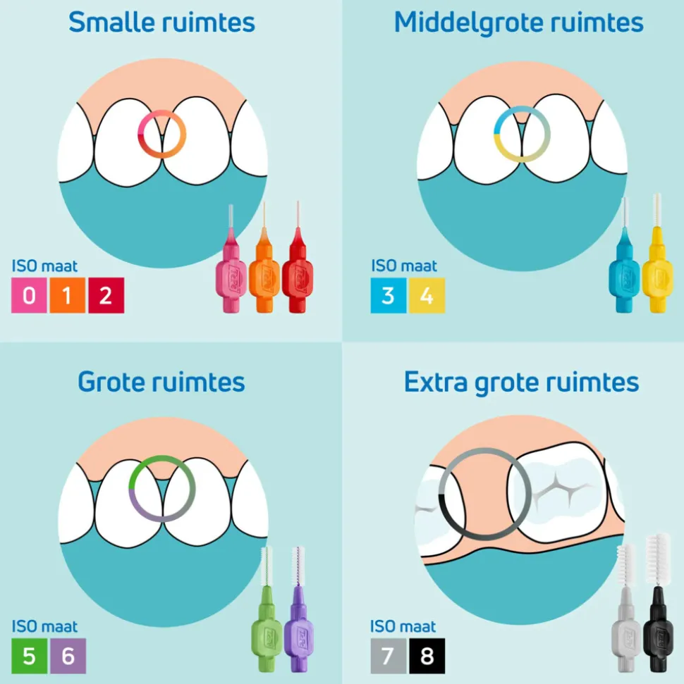 De ragers zijn beschikbaar van onze kleinste maat 0,4 mm (roze) tot 1,5 mm (zwart). Je hebt vaak meer dan één borstelmaat nodig. Je tandarts of mondhygiënist kan je helpen bij het kiezen van de juiste borstelmaat of -maten. Als je niet naar de tandarts of mondhygiënist kunt gaan onthoud dan dat een rager goed moet passen, maar nooit tussen de tanden moet worden geforceerd. Een kleine tip is om te beginnen met de kleinste maat; roze waarna je steeds een grotere maat kunt pakken totdat je de borstel tegen je tand en tandvlees voelt drukken.