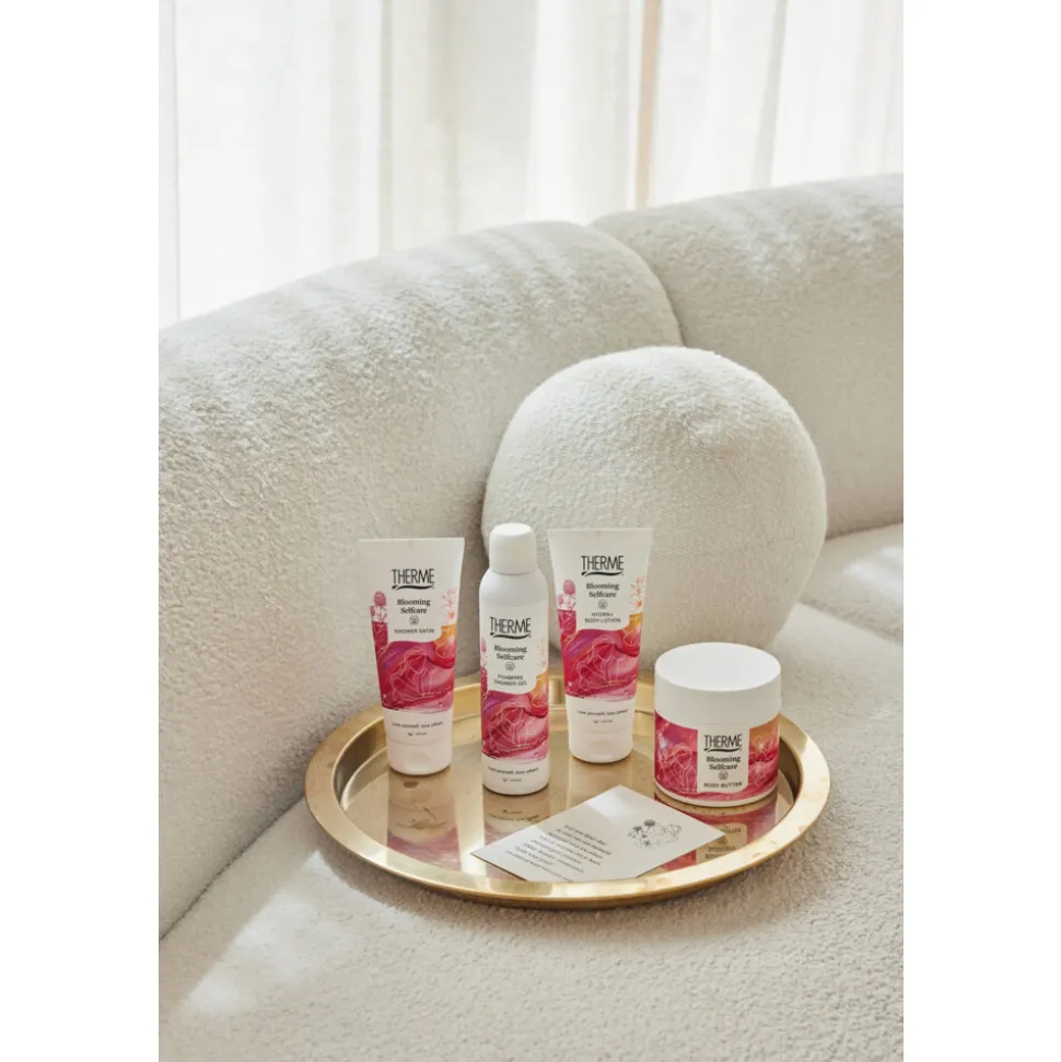Therme Blooming Selfcare is geïnspireerd op het belang van liefdevolle aandacht geven aan jezelf, zodat je die ook kunt geven aan anderen. Creëer je eigen wellnessritueel en verwen je huid na het douchen met een Therme Blooming Selfcare verzorgingsproduct.