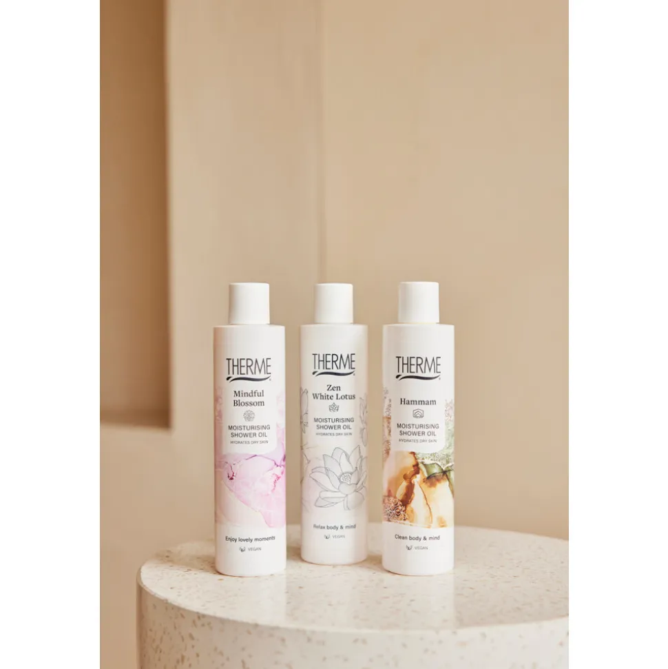 Therme Mindful Blossom Moisturising Shower Oil is een rijkgeurende en verzorgende crèmige doucheolie die transformeert naar een zijdezacht schuim en tot wel 24 uur intensief hydrateert. Geniet tijdens én na het douchen van een ultiem zacht huidgevoel en de vefijnde geur. Ontspan en prikkel je zintuigen met deze luxe wellnessbeleving. Uitermate geschikt voor de (zeer) droge huid.