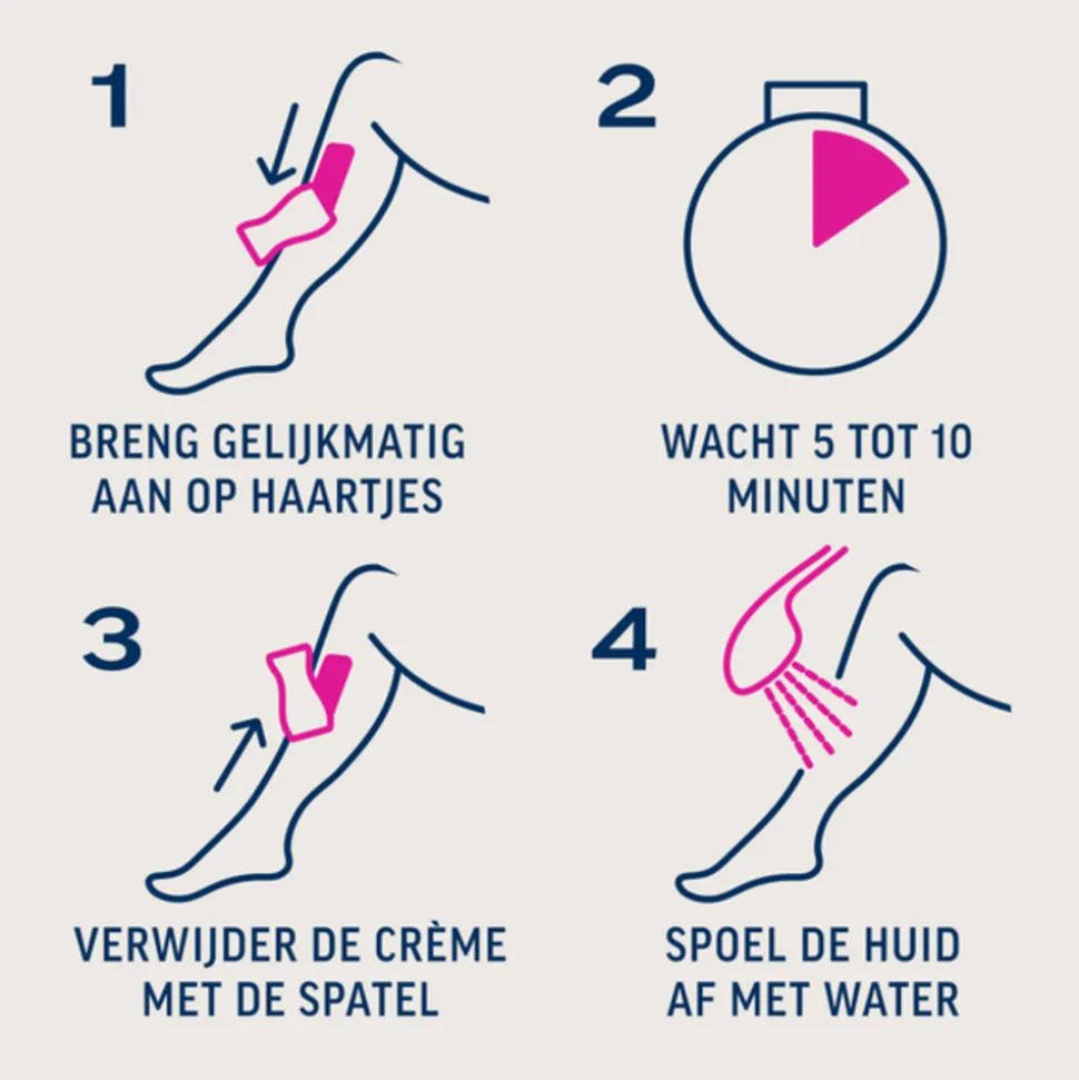- Zorg ervoor dat de huid waarvan u haar wilt verwijderen volledig bedekt is met crème. Niet inwrijven en spoel uw handen grondig af na gebruik.