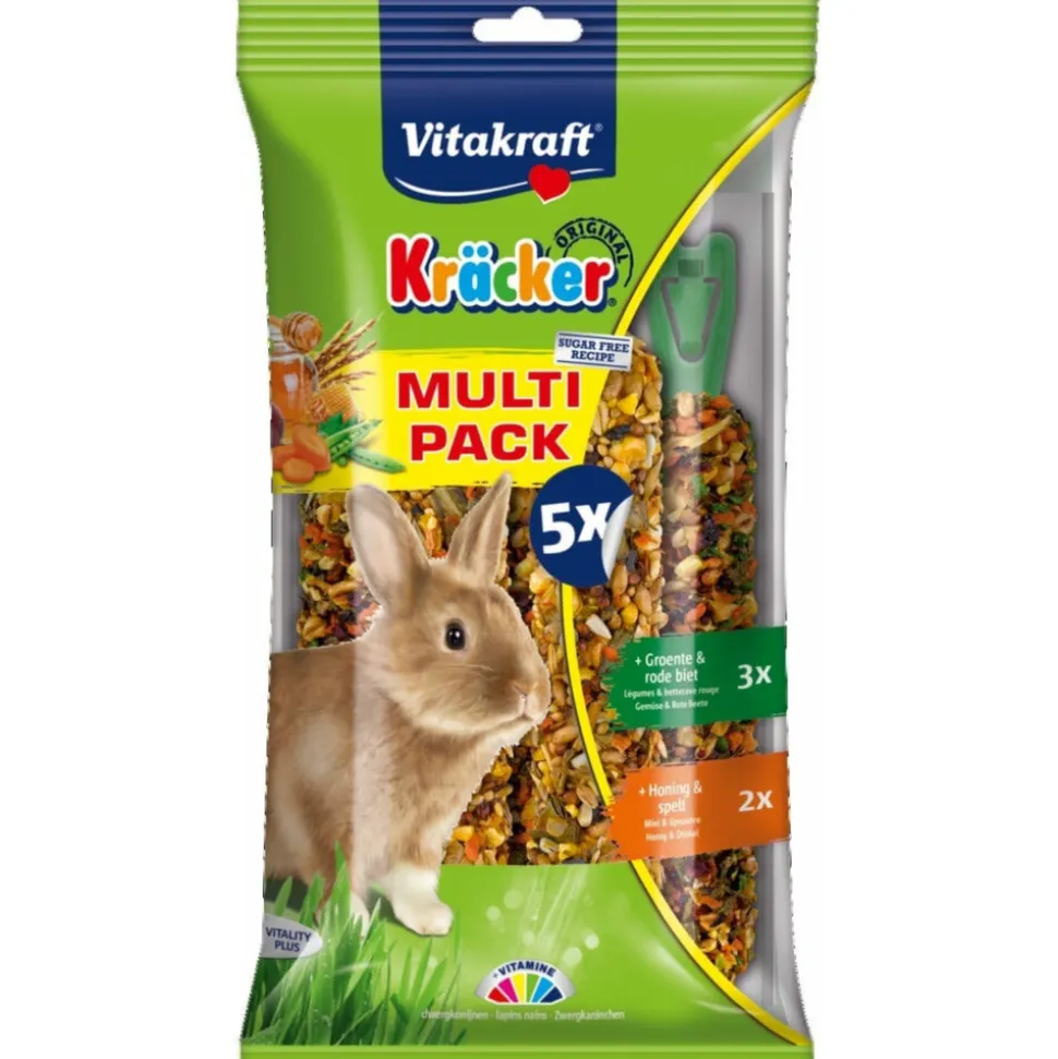 De orginele multipack Vitakraft Kräckers zijn een verantwoorde lekkernij met 3 groente, bieten kräckers en 2 honing, spelt kräckers. Ze bevatten lekkere granen, groente, bieten, honing en spelt op een natuurlijk knabbelhoutje. De Kräckers zijn lekker van smaak en 3-voudig gebakken waardoor de ingrediënten stevig vastzitten en het konijn bezig wordt gehouden zoals dit in de vrije natuur ook gebeurt. Dit geeft het konijn de nodige beweging en zorgt ervoor dat hij zijn snijtanden op natuurlijke wijze kan afslijten.