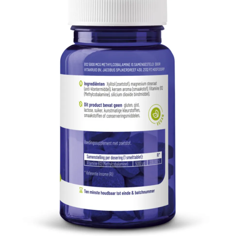 Vitakruid B12 Methylcobalamine is een voedingssupplement met een hoog gedoseerde methylcobalamine, een vorm van vitamine B12, die zeer goed door het lichaam wordt opgenomen. Methylcobalamine draagt bij aan een normale werking van het perifere zenuwstelsel, ruggenmerg en hersenen. Daarnaast speelt het een rol in de normale werking van het totale immuunsysteem en het op peil houden van homocysteïnegehalte in het bloed.
